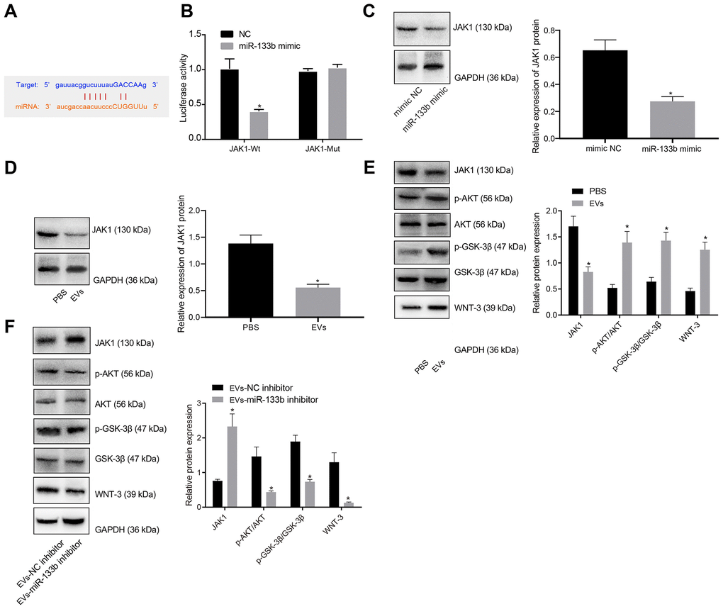 miR-133b in EVs derived from BMSCs targeted JAK1 to Activate the AKT-GSK-3β-WNT pathway