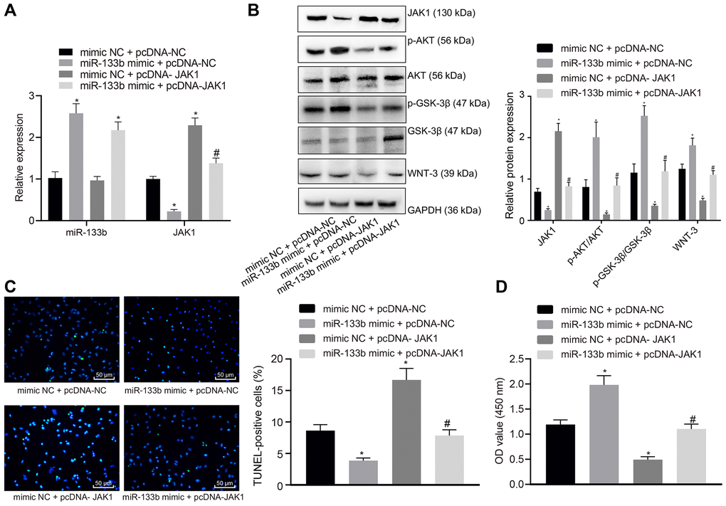 Following treatment with cobalt chloride, miR-133b mimic and pcDNA-JAK1 were transduced into the neuronal cells. RT-qPCR (Figure 6A) revealed that in the presence of pcDNA-NC, miR-133b expression was elevated while the JAK1 expression was reduced by addition of miR-133b mimic compared to mimic NC while upregulated JAK1 expression was observed in the presence of mimic NC + pcDNA-JAK1. In the presence of miR-133b mimic, the addition of pcDNA-JAK1 restored the JAK1 expression. Further Western blot analysis (Figure 6B), TUNEL assay (Figure 6C) and CCK-8 assay (Figure 6D) showed that the enhancement of miR-133b resulted in elevations in p-AKT/AKT and p-GSK-3β/GSK-3β ratios, WNT-3 protein level and survival rate as well as a reduction in the apoptosis rate. However, restoration of the JAK expression decreased the p-AKT/AKT and p-GSK-3β/GSK-3β ratios as well as WNT-3 protein level corresponding to a lower survival rate and a higher apoptosis rate. Furthermore, the effects of miR-133b mimic were evidently counteracted by pcDNA-JAK1. To conclude, miR-133b exerted vital protective effects on the survival of neuronal cells following the induction of hypoxia through inhibition of JAK1.