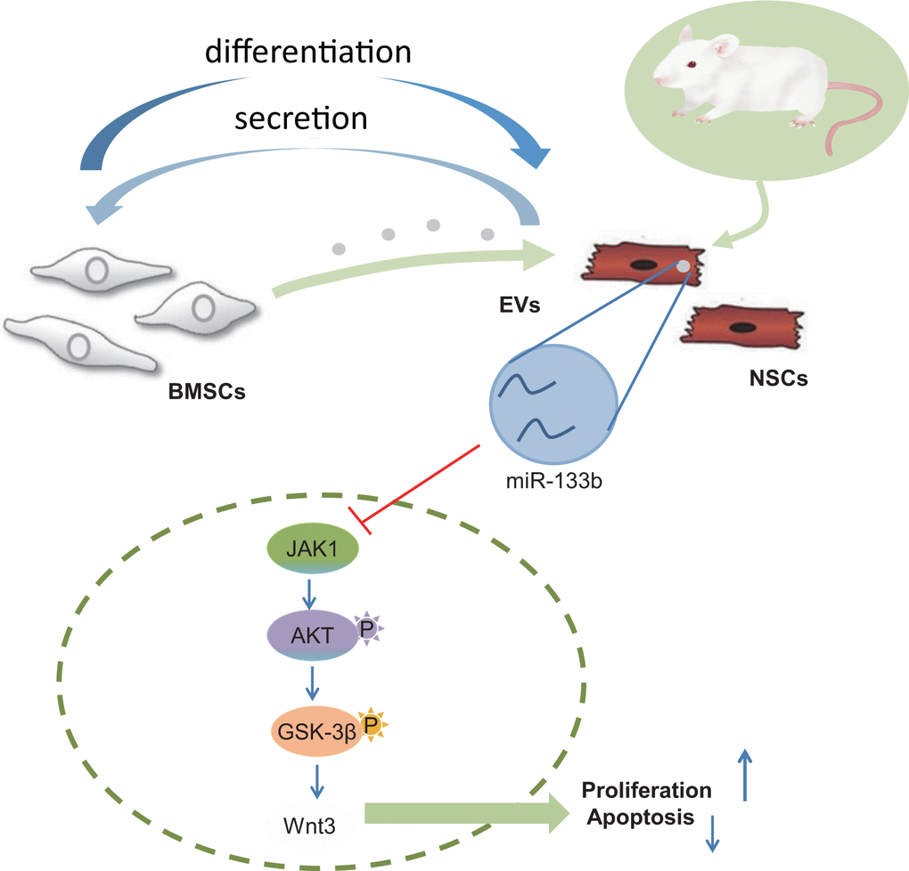 In conclusion, our findings have proved that EVs from BMSCs can shuttle miR-133b into NSCs to amplify neuronal cell survival (depicted in Figure 7). Thus, a combination of BMSCs-derived EVs-incorporated miR-133b and NSC transplantation may serve as a promising new insight for developing therapeutic treatments for CA-induced brain damage. However, the research is still in the preclinical stage, and the investigation on the mechanism of action is insufficient. Further experiments are warranted to omit the effects of stem cell differentiation on increased neuronal cell number.