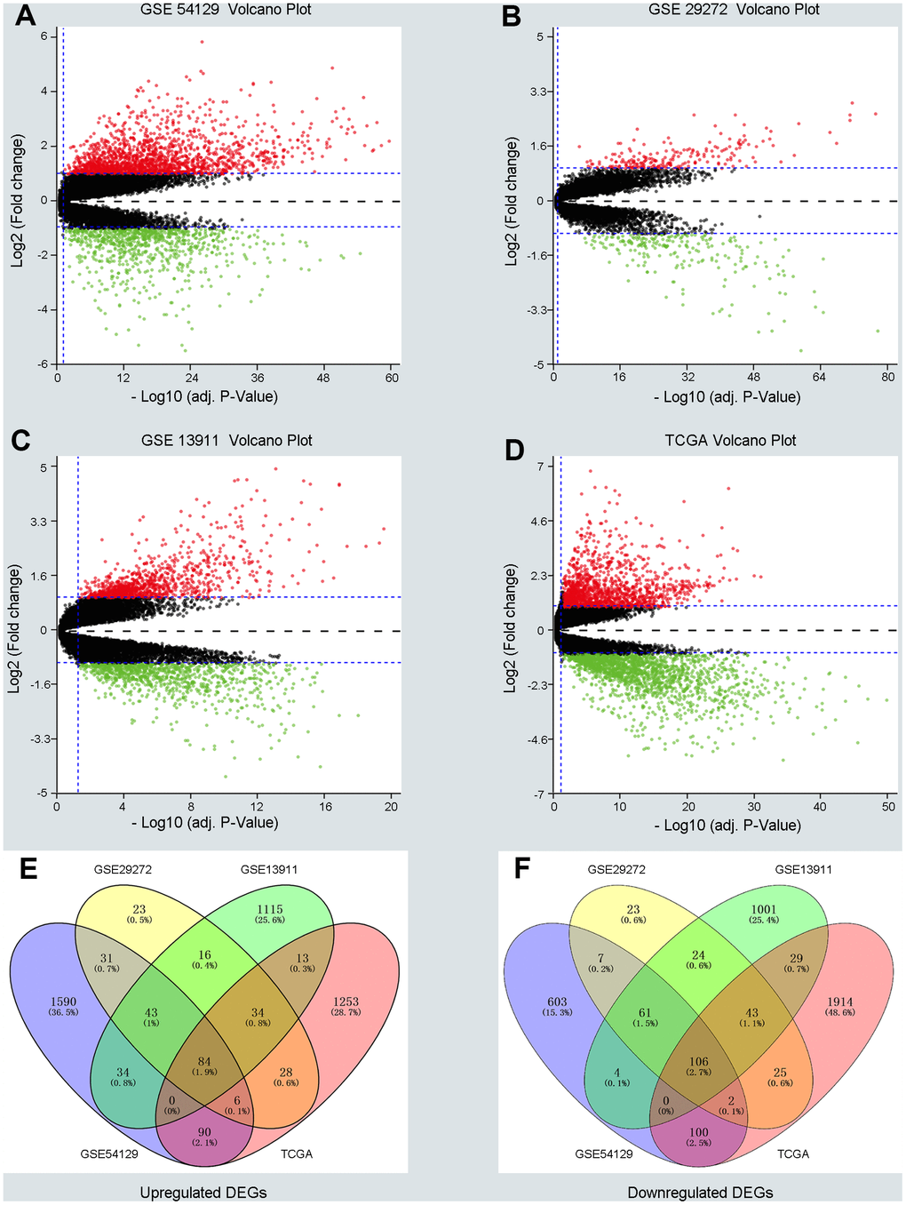 Three GEO (GSE54129, GSE29272, GSE13911) and one TCGA dataset were enrolled in a training group comprising663 cancer samples and 223 normal cases. Dataset GSE54129 contained111 GC samples and 21 non-tumor samples; dataset GSE29272 contained 134 GC samples and 134 non-tumor samples; dataset GSE13911 contained 38 GC tissues and 31 non-tumor samples; and the TGCA dataset contained 380 GC tissues and 37 non-tumor samples. DEGs in the training group were identified and are displayed in the volcano plot in Figure 1 with thresholds of |log2FC| >1 and a P value < 0.05 (Figure 1A–1D). As depicted in Venn plots (Figure 1E, 1F), we integrated commonly expressed genes that intersected in the training group, and we successfully identified 84 upregulated and 106 downregulated DEGs. The details of these DEGs, which were chosen for the following analysis, can be found in Supplementary Table 1 (Supplementary Table 1).