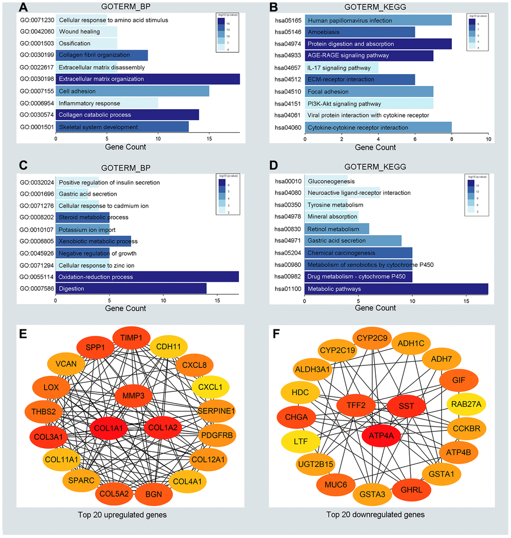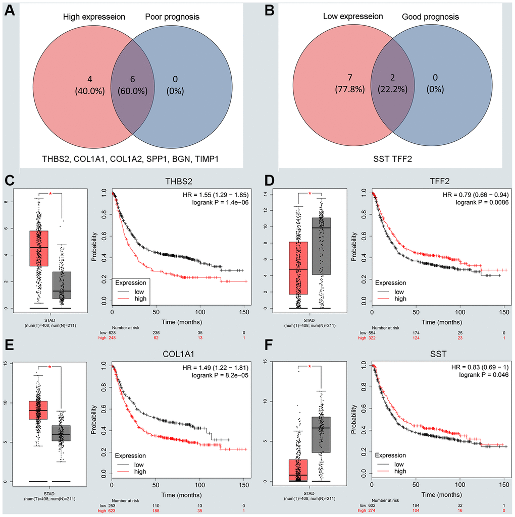 To understand the interaction between the upregulated DEG group and the downregulated DEG group separately, a PPI network was constructed. We calculated the node degree of the PPI network using cytoHubba tools from Cytoscape software and classified the top 20 hub genes into two groups (Figure 2E, 2F). Next, to improve our result reliability, we verified the top 10 hub genes in the validation group. The GSE27342 dataset contained 80 GC samples and 80 normal samples; theGSE37023 dataset contained112 tumor samples and 39 normal samples; and theGSE65801 dataset contained 32 cancer samples and 32 normal samples. All the hub genes were involved in the validation group (Supplementary Figure 2A, 2B). Subsequently, GEPIA and Kaplan Meier (KM) plot database was performed to assess each hub gene’s expression and its relationship to prognosis. In the upregulated hub gene group, 6 genes (COL1A1, COL1A2, TIMP1, SPP1, BGN, and THBS2) were not only significantly upregulated in GC but also strongly correlated with poor GC prognosis (Figure 3A, 3C and 3E). As for downregulated hub genes, two genes (SST, TFF2) were expressed at a low level in GC and were correlated with a favorable GC prognosis (Figure 3B, 3D and 3F). Other candidate hub genes, which were chosen for the following analysis, are shown in Supplementary Figure 2C–2F).