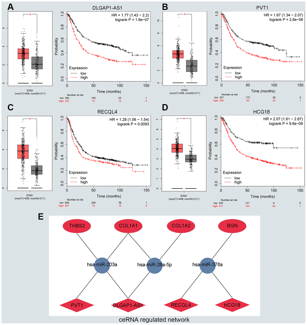 To predict upstream lncRNA of candidate miRNAs, we used the miRNet database. According to the prediction in Supplementary Table 3, we identified 139 lncRNAs for 6 downregulated miRNAs and 36 lncRNAs for miR-9-5p. Next, GEPIA and the KM plotter database were used to evaluate the expression role and prognostic value of predicted lncRNAs. According to the ceRNA hypothesis motioned above, we screened out 4 eligible lncRNAs (DLGAP1-AS1, PVT1, RECQL4 and HCG18) associated with downregulated miRNAs that were both significantly upregulated in GC and correlated with very poor survival (Figure 4A–4D). However, there was no qualified lncRNA that met the expression and prognostic criteria of miR-9-5p. Finally, we identified the eligible lncRNAs, miRNAs and mRNAs that not only satisfied the standards for expression and prognosis but also complied with the ceRNA network hypothesis.