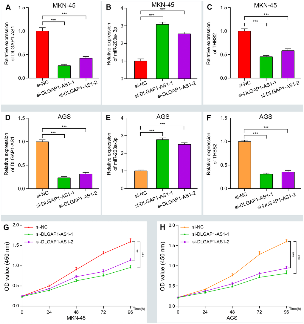 Three siRNAs (si-DLGAP1-AS1#1: 5’-GCU AUA UGU CUG GUA AAC AGA-3’, si-DLGAP1-AS1#2: 5’-CAG AAU AAA UAG UAC UUG AGC-3’ andsi-DLGAP1-AS1#3: 5’-GCU GCU AUA UGU CUG GUA AAC-3’) and negative control siRNA were purchased from Riobio Company (Guangzhou, China) and separately transfected into MKN-45 and AGS cells using Lipofectamine 3000 (Invitrogen, USA). Then, the qRT-PCR assay was performed to evaluate knockdown efficiency and detect the relative expression of DLGAP1-AS1, miR-203a-3p and THBS2 through the SYBR-green method. Primer sequences were also synthesized by Riobio as shown as follows: DLGAP1-AS1:5’-GGG GCA GGA GTA AAG TGG AC-3’ (forward), 5’-CCA GAC ATA TAG CAG CCG GG-3’ (reverse); miR-203a-3p: 5’-CAC CAT AAA GAC AGG AAC CTG-3’ (forward), 5’-GGA GGT GCC ATC AAT ACC TGC-3’ (reverse); THBS2: 5’-TTA TGG CGT TGC ATC CAG GT-3’ (forward), 5’-GTG GTG CAG AGG AGA TGT GT-3’ (reverse); and GAPDH:5’-GAT TTG GTC GTA TTG GGC GC-3’ (forward), 5’-GCG CCC AAT ACG ACC AAA TC-3’ (reverse). The relative expression levels were quantified using the 2−ΔΔCt method.