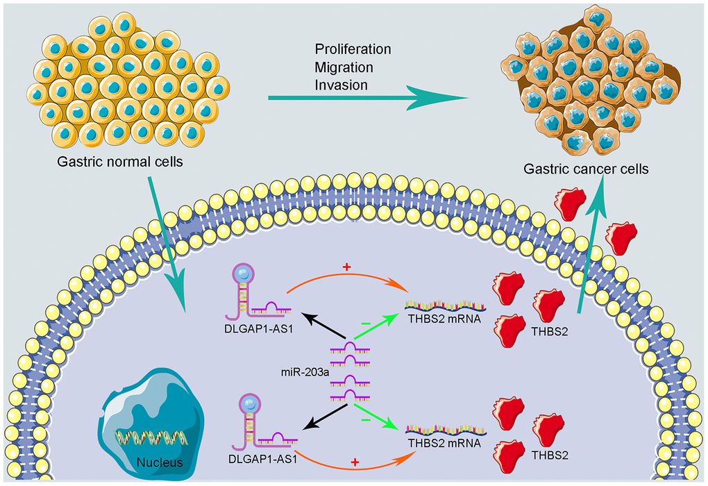 To further evaluate the reliability of our result, we verified the ceRNA network using an in vitro assay. First, the relative expression level of DLGAP1-AS1 was quantified in 4 GC cell lines (MKN-45, AGS, HGC-27 and MGC-803), as well as and normal gastric cells (GES-1). Our results indicated that MKN-45 and AGS express higher levels of DLGAP1-AS1 than other cell lines (Supplementary Figure 6A). Therefore, we designed siRNA assay to knockdown the expression of DLGAP1-AS1 in MKN-45 and AGS cell lines separately and observed the change in relative expression of DLGAP1-AS1, miR-203a-3p, and THBS2. The knockdown efficiency was measured by qRT-PCR (Supplementary Figure 6B, 6C). As presented in Figure 5A–5F, the expression levels of DLGAP1-AS1 and THBS2 were significantly reduced, while the relative expression of miR-203a-3p was enhanced after DLGAP1-AS1 knockdown both in MKN-45 and AGS cell lines. A CCK-8 assay revealed that silencing DLGAP1-AS1 could significantly inhibit gastric cancer cell proliferation (Figure 5G, 5H). And the raw data of our results are shown in Supplementary Table 4. Furthermore, a migration and invasion assay indicated that DLGAP1-AS1 knockdown also plays an inhibitor role in GC migration and invasion (Supplementary Figure 7A–7D). The DLGAP1-AS1/miR-203a-3p/THBS2 ceRNA pathway and its potential roles in the progression of GC is illustrated in schematic representations in Figure 6. Altogether, we have described a ceRNA network that could shed light on the oncogenesis of GC and may contain future diagnostic markers and therapeutic targets.