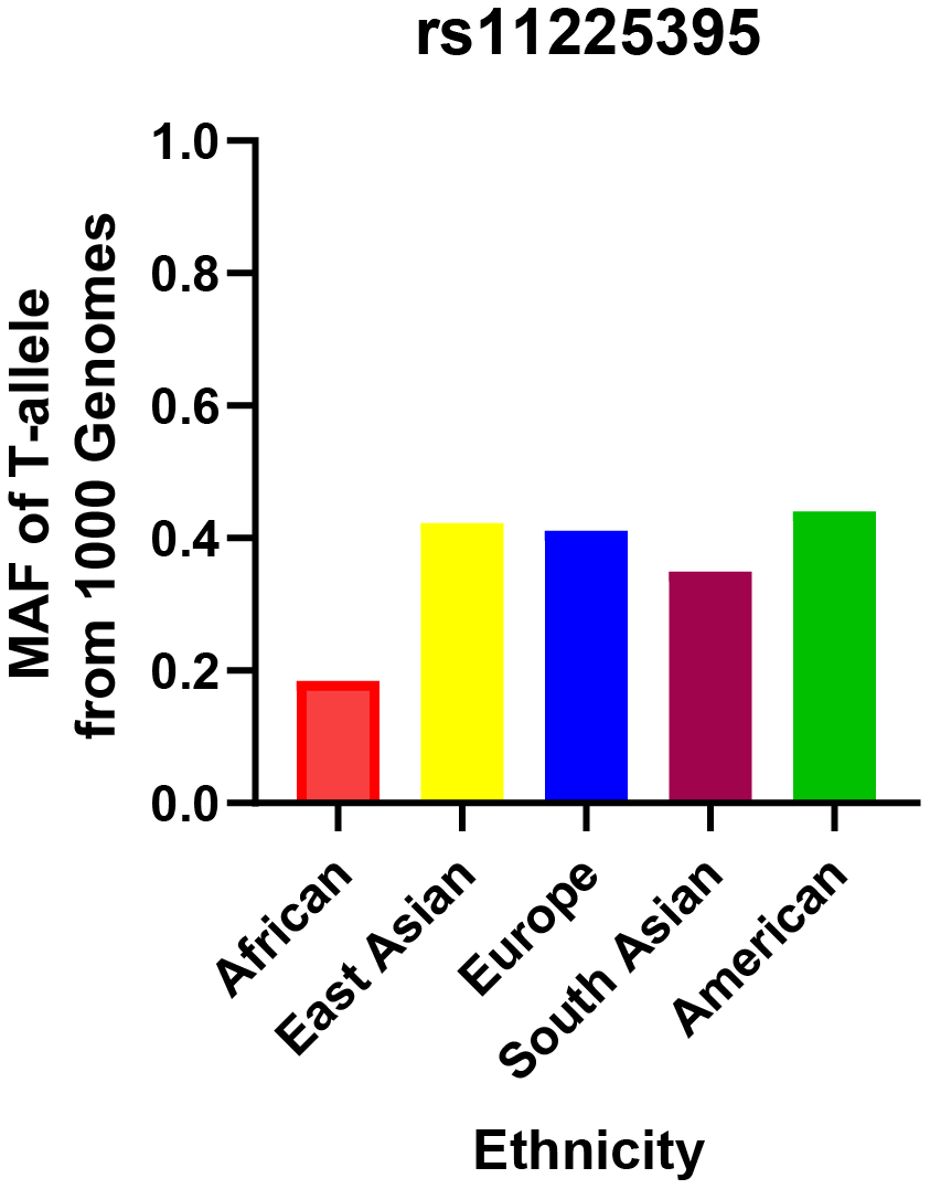 The relationship between this locus and CRC risk is presented in Table 2. The genotype distributions in control groups were in accordance with HWE test (P > 0.05). The minor allele frequency (MAF) of the rs11225395 polymorphism for CRC cases was 0.27. In addition, we summarized the MAF for different populations around the world in Figure 1, which was obtained from the 1000 Genomes repository [33]. The TT or CT+TT genotypes were shown to increase the susceptibility to CRC (TT vs. CC: OR, 1.76; 95%CI, 1.09–2.84; P = 0.021). The associations remained statistically significant even after adjusting for gender and age. Additionally, the T allele was shown to increase the risk of CRC.