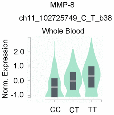 The data from the GTEx Portal database (https://www.gtexportal.org/home/) were utilized to evaluate the link between genotypes of the MMP-8 rs11225395 polymorphism and mRNA expression-level alteration [34].