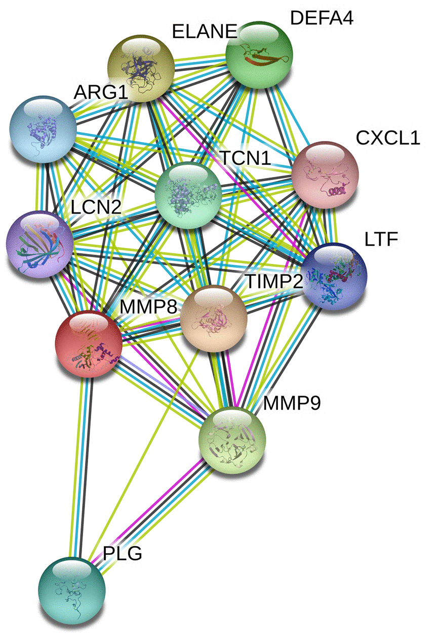 Data from the GTEx portal uncovered that the rs11225395 polymorphism was shown to alter the expression of MMP-8 gene in whole-blood samples (P = 3.5e-17) (Figure 2). In addition, several genes including TIMP2, ELANE, MMP-9, DEFA4, TCN1, PLG, ARG1, LTF, LCN2, CXCL1 were involved in the interaction of MMP-8 (Figure 3), which was discovered by using the String online tool (http://string-db.org/).