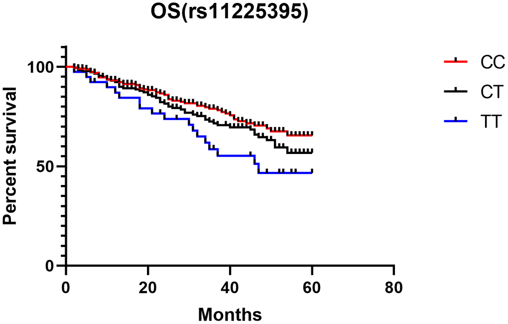 Survival analysis of CRC patients with the MMP-8 gene rs11225395 polymorphism
