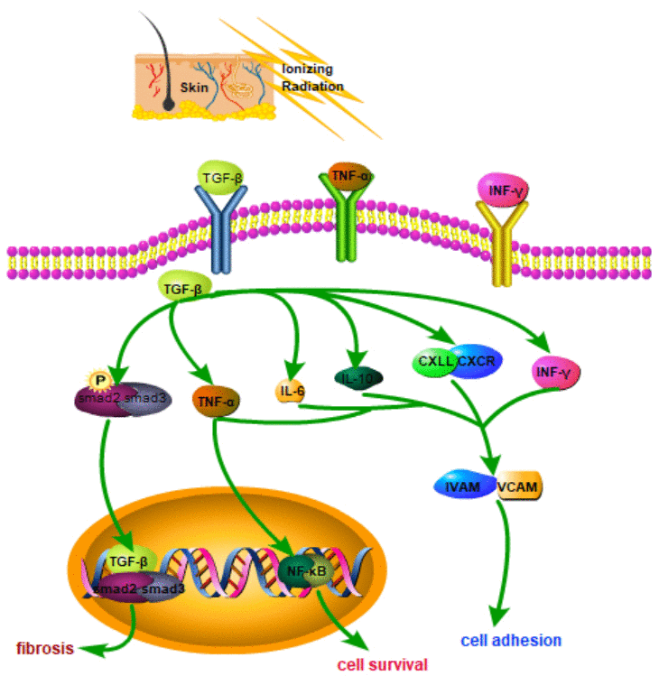 Ionizing radiation is capable of affecting G2- and M-phase cells in the cell cycle, thereby causing apoptosis and impaired cell proliferation and migration; as a result, an overall cell depletion is caused. Ionizing radiation can damage collagen structures. Cell proliferation is suppressed in irradiated wounds. Increased matrix metalloproteinases (MMPs) that are not counteracted by tissue inhibitors of MMPs (TIMP) cause abnormal degradation of ECM. Under decreased angiogenesis and increased transforming growth factor-β (TGF-β) levels, blood vessels show variations, causing increased endothelial fibrosis; subsequent occlusion of the vascular lumen causes tissue hypoxia. The low expression level of apoptosis-inhibiting gene Ras and the over-expression of apoptosis-inducing genes p35 and others attributed to radiation during radiotherapy causes excessive apoptosis in patients’ bodies; thus, their skin is damaged. Existing studies reported that considerable radiation is generated during radiotherapy, and the reactive oxygen species and free radicals generated by the radiation can seriously damage the basal cells of the human body. Moreover, radiation inhibits the basal cell division and migration of keratinization function, inducing RSI in patients having received radiotherapy [32]. Moreover, radiation can lead to high expression levels of p53 and Bax proteins; it causes apoptosis and necrosis of local tissues (e.g., vascular endothelial cells, fibroblasts and epidermal cells); it adversely affects the process of neovascularization, wound margin contraction, as well as wound epidermalization [33]. Existing studies revealed that cytokines are directly or indirectly involved in radiation-induced damage [34]. IL-10 is capable of inhibiting the inflammatory response and reducing the activity of macrophages [34]. Neutrophils refer to the first cells that intrude the wound site within minutes after injury. They undergo apoptosis and are phagocytosed by macrophages 24–48 h after injury. The mentioned macrophages engulf cell debris and secrete growth factors that are critical to wound healing.