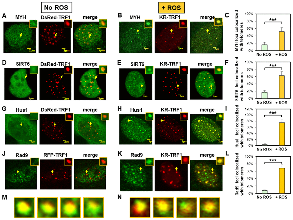 We have shown that the endogenous SIRT6 and tagged SIRT6 proteins are recruited similarly to telomeres [39]. To confirm that endogenous mMyh and mHus1 proteins behave in a similar manner as tagged proteins in live cells, we proceeded with immunofluorescence staining to determine their response to DNA damage at telomeres. As shown in Supplementary Figure 4, the endogenous mMyh and mHus1 behaved in a similar manner as GFP-tagged proteins in regard to their colocalization with telomeres. About 20% of granulated mMyh spots were localized to RFP-TRF1 at telomeres, as seen in the merged images of 20 cells from each group (Supplementary Figure 4C). In undamaged cells, only 7% of mHus1 foci colocalized with telomeres (Supplementary Figure 4D and 4F). After ROS induction by activating the KR protein, mMyh and mHus1 formed discrete nuclear foci (Supplementary Figure 4B and 4E, yellow foci in the merged images). By analyzing 20 cells from each group, over 80% of mMyh or mHus1 foci showed colocalization with KR-TRF1 after KR activation (Supplementary Figure 4C and 4F). In summary, our data suggest that MYH, SIRT6, and 9-1-1 are recruited to telomeric chromatin to repair oxidative DNA damages.
