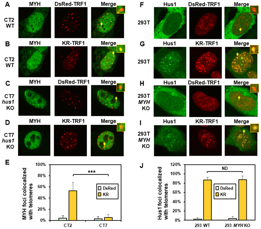 Next, we examined GFP-Hus1 foci formation at telomeres in KR-TRF1-transfected MYH KO cells. For this purpose, the hMYH gene in human HEK-293T cells was knocked out by CRISPR-Cas9 method [62]. After transfection, with MYH crRNA 2 plasmid colonies were selected with 1.25 μg/ml puromycin and single colonies were screened, expanded, and confirmed by DNA sequencing and Western blot analysis. MYH KO clone 7a did not contain hMYH proteins in Western blotting (Supplementary Figure 5A). PCR and DNA sequencing analyses indicated that one allele of the hMYH gene contained an adenine insertion and the other allele contained a 229-bp deletion in MYH KO clone 7a. The majority of Hus1 were in cytoplasm (Figure 2F and 2H) and very few granulated GFP-Hus1 spots were colocalized with telomeres (Figure 2J) in undamaged control HEK-293T and MYH KO cells. After ROS induction by activating the KR protein, GFP-Hus1 formed discrete nuclear foci of which about 90% colocalized with KR-TRF1 marked telomeres in both HEK-293T and MYH KO HEK-293T cells (Figure 2G, 2I, and 2J). Thus, Hus1 foci formation at damaged telomeres is independent of MYH.