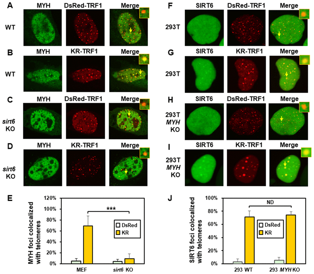 We then examined SIRT6 foci formation at KR-TRF1-induced damaged telomeres in HEK-293T and MYH KO HEK-293T cells. There were some granulated GFP-SIRT6 spots in both undamaged cells (Figure 3F and 3H). It appeared that more granulated GFP-SIRT6 spots were in undamaged MYH KO cells than control HEK-293T cells, although this was not statistically significant (Figure 3J). After ROS induction by activating the KR protein, GFP-SIRT6 formed discrete nuclear foci of which about 70% colocalized with telomeres in both HEK-293T and MYH KO cells (Figure 3G, 3I, and 3J). In summary, MYH foci formation at damaged telomeres is dependent on SIRT6, but SIRT6 recruitment to damaged telomeres is independent of MYH.