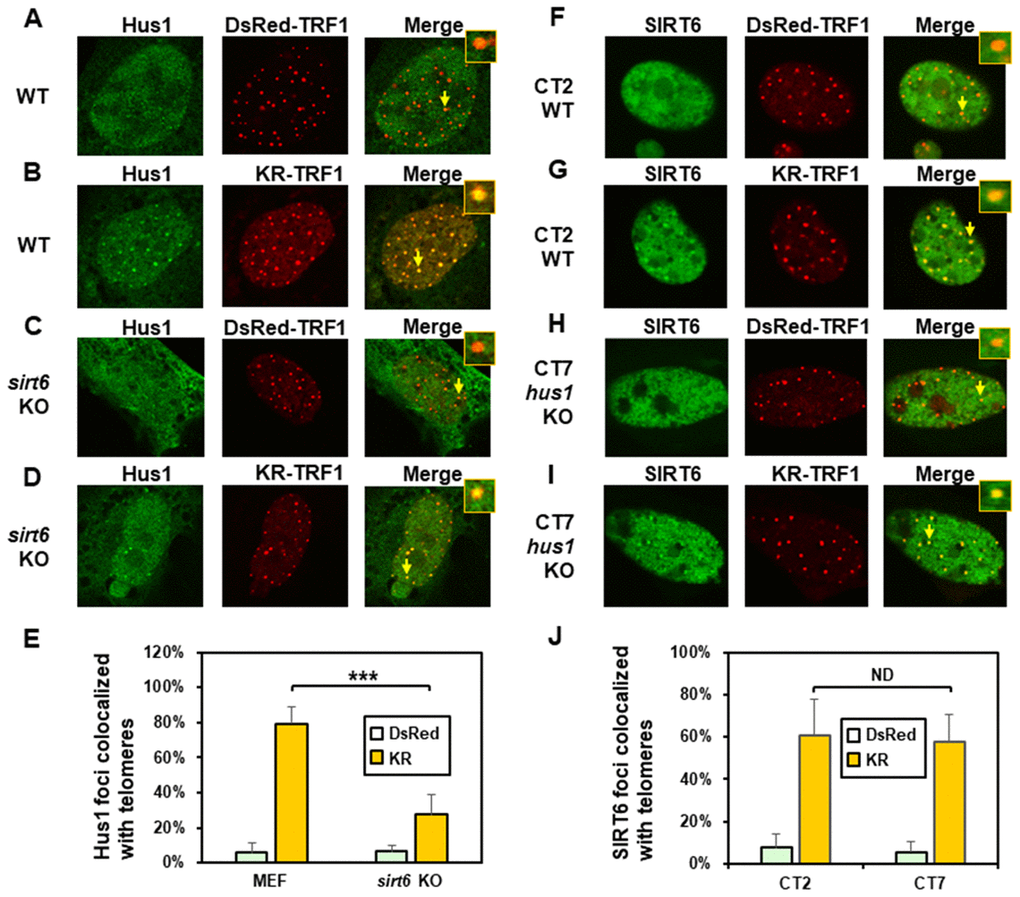 We also determined the order of Hus1 and SIRT6 association at damaged telomeres. As expected, about 80% of GFP-Hus1 foci colocalized with telomeres in WT MEF cells after ROS induction (Figure 4B and 4E). In undamaged sirt6-/- MEF cells, Hus1 was present in both the cytoplasm and nucleus (Figure 4C). GFP-Hus1 did form foci at damaged telomeres in damaged sirt6-/- MEF cells, however, only about 30% of Hus1 foci colocalized with KR-TRF1 marked telomeres (Figure 4D and 4E, yellow foci in the merged image) and some telomeres did not contain Hus1 foci (Figure 4D, red foci in the merged image). Therefore, Hus1 foci formation at damaged telomeres is partially dependent on SIRT6. We then examined SIRT6 foci formation at KR-TRF1-induced damaged telomeres in CT2 (hus1+/+) and CT7 (hus1-/-) cells. The responses of SIRT6 to damaged telomeres were similar in both cell lines (Figure 4F–4I). As shown in Figure 4J, about 60% of GFP-SIRT6 foci colocalized with telomeres in both WT and hus1 KO MEF cells after ROS induction. Thus, SIRT6 foci formation at damaged telomeres is independent of Hus1.
