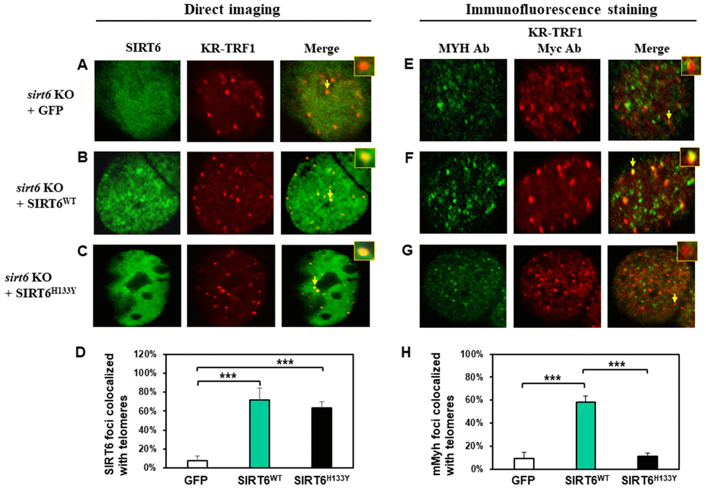 It has been shown that both protein deacetylase and ADP-ribosylase activities of SIRT6 facilitate DNA repair [63]. Since SIRT6 is required for MYH recruitment to damaged telomeres, we examined whether its catalytic activities were necessary for this function. We tested whether SIRT6H133Y mutation could affect the recruitment of MYH to damaged telomeres. SIRT6H133Y mutant has been shown to lack both NAD+-dependent protein deacetylation and ADP-ribosylation [38, 41] while also having very weak defatty-acylase activity [64]. MEF sirt6 KO cells were transfected with vector or vector containing wild-type (WT) or H133Y mutant hSIRT6 gene along with KR-TRF1 plasmid. As shown in Figure 5B–5D, direct imaging showed that similar percentages of hSIRT6WT and hSIRT6H133Y were colocalized with damaged telomeres. This indicates that the catalytic activities of SIRT6 are not necessary for SIRT6 response to damaged sites. Because the transfection frequencies with three plasmids into MEF cells are very low, we selected to examine endogenous mMyh in MEF cells transfected with two plasmids. We first tried to detect endogenous mMyh by immunofluorescence staining with blue emission secondary antibody in MEF cells containing GFP-SIRT6 and KR-TRF1. However, we were unable to clearly define blue mMyh foci because their signal was obscure and also interfered by the green and red fluorescence. We modified the method by stripping all fluorescence by HCl treatment after KR activation. mMyh, GFP-SIRT6, and Myc-KR-TRF1 were then detected by MYH, GFP, and Myc antibodies which were reacted with green, blue, and red emission secondary antibodies, respectively. Cells containing blue-colored GFP-SIRT6 were selected for analyses of the colocalization of mMyh green foci and red-colored telomeres (Figure 5E–5G). Approximately 9% of mMyh foci were observed in damaged sirt6-/- cells transfected with vector alone (Figure 5E and 5H). This result is similar to that with GFP-MYH in sirt6-/- cells (Figure 3E). After ROS induction by activating the KR protein, approximately 60% of mMyh foci were colocalized with KR-TRF1 in MEF sirt6 KO cells expressing hSIRT6WT protein (Figure 5F and 5H). Interestingly, the telomere colocalizations of mMyh was absent in sirt6 KO cells expressing hSIRT6H133Y mutant (Figure 5G and 5H). This result indicates that the activities of SIRT6 are essential for MYH recruitment to damaged telomeres.