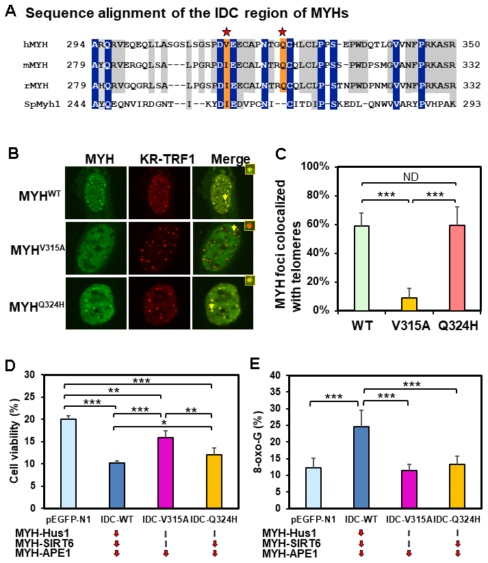 The IDC of MYH has a unique architecture [56] that serves as a hub for interactions with Hus1, SIRT6, and APE1 [40, 55, 65]. V315 and Q324 of hMYH are important for interaction with Hus1 [55, 66] (red stars in Figure 6A). However, residue Q324 of hMYH is dispensable for interaction with SIRT6 [40]. To determine how these residues control MYH association with damaged telomeres, we expressed GFP-MYHWT, GFP-MYHV315A, or GFP-MYHQ324H along with KR-TRF1 in CT2 MEF cells. The results (Figure 6B and 6C) demonstrated that the association of GFP-MYHV315A (but not GFP-MYHQ324H) with damaged telomeres was substantially attenuated. Taken together with the results, and the deficiency of MYH mutants in protein-protein interactions, SIRT6 is an essential partner for MYH association with damaged telomeres.