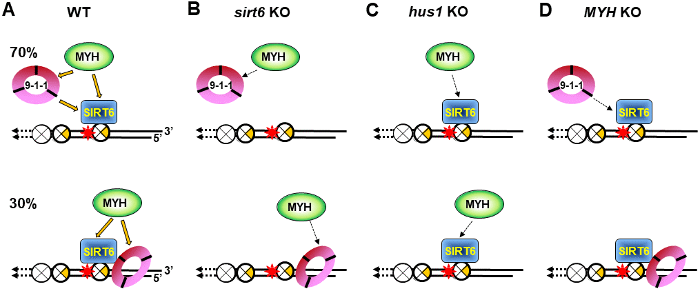 DNA repair also requires chromatin remodeling. The aging regulator SIRT6 is a NAD+-dependent histone/protein deacetylase (reviewed in [29]) and also has mono-ADP-ribosyltransferase and defatty-acylase (protein lysine fatty acyl removal) activities [29, 30]. SIRT6 has roles in stress response, DNA repair, telomere integrity, retrotransposition, and metabolic homeostasis [29, 31–36]. Importantly, SIRT6 overexpression extends lifespan [37] and its depletion leads to premature cellular senescence [31, 32, 38]. SIRT6 can recruit SNF2H (one of the ISWI chromatin remodeling complexes) to DNA break sites [34] and to oxidatively damaged telomeres [39], leading to locally decondensed chromatin. SIRT6 plays a direct role in BER and DNA damage response through physical interactions and functional stimulation [40–43]. Particularly, SIRT6 directly interacts with MYH, APE1, and 9-1-1; and stimulates MYH and APE1 activities, thus connecting chromatin remodeling and MYH-directed BER [40].