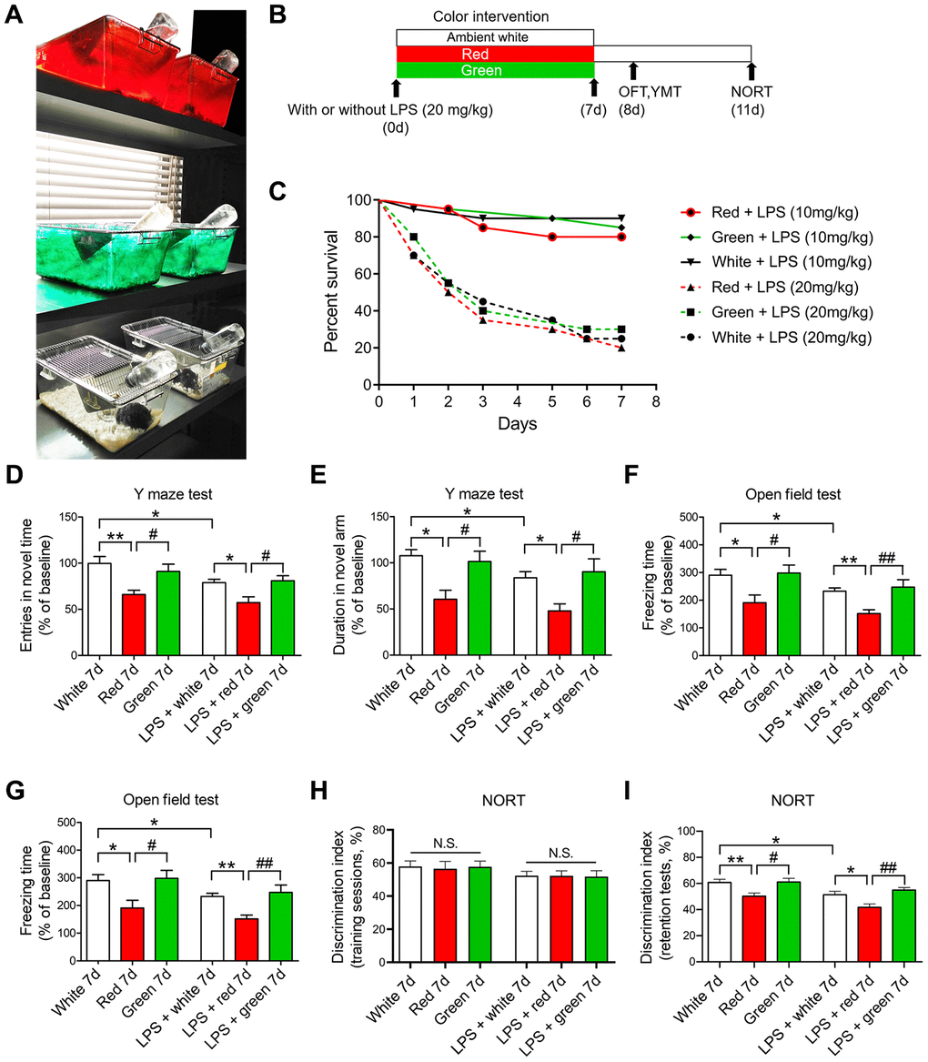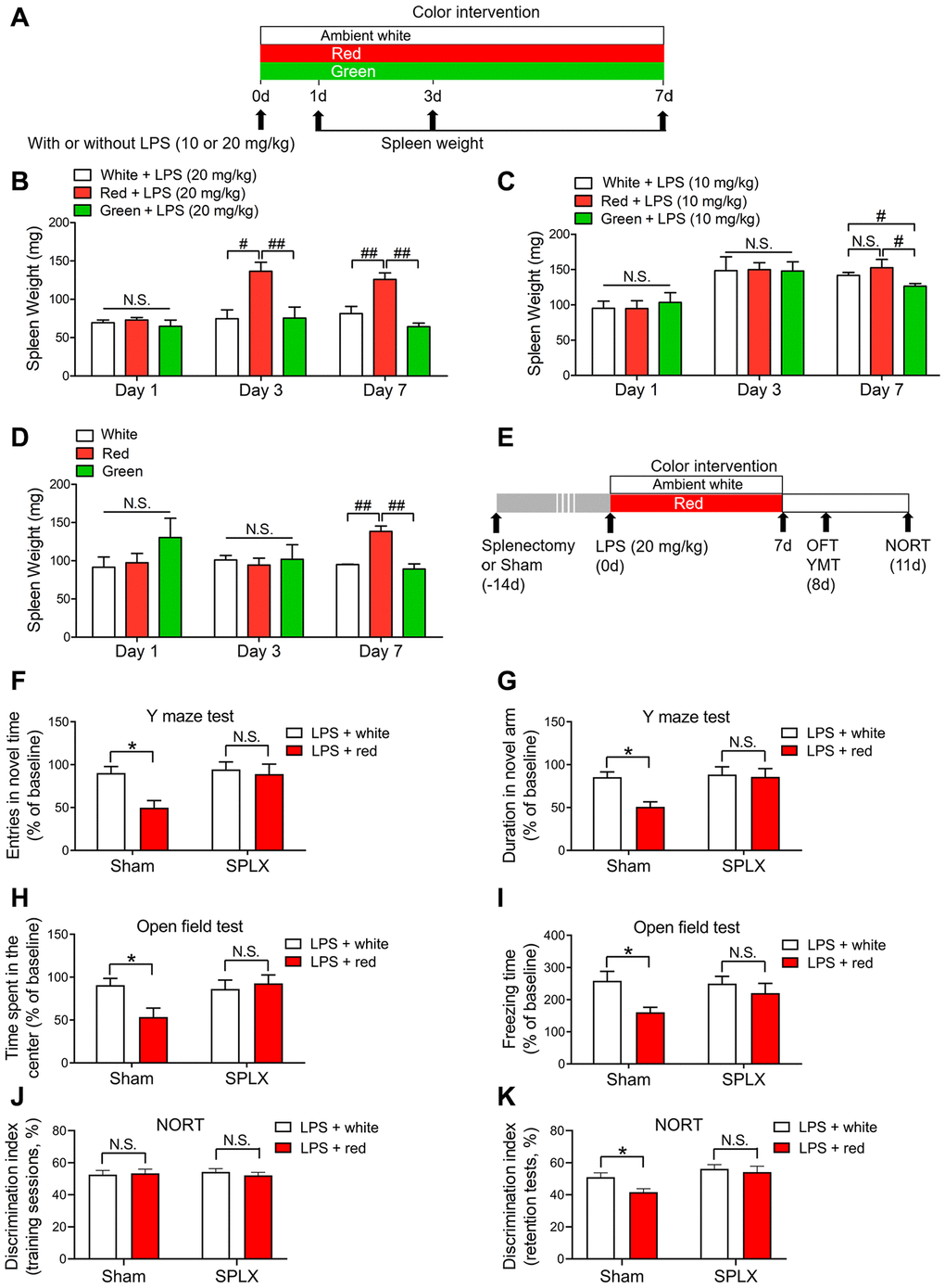 In part B, mice underwent a splenectomy or a sham operation 14 days before LPS (20 mg/kg) administration, and then were exposed to red, green or ambient white light for seven days after LPS treatment. Y maze and open field tests were conducted on day 8, and a NORT was performed on day 11 after the commencement of light exposure.
