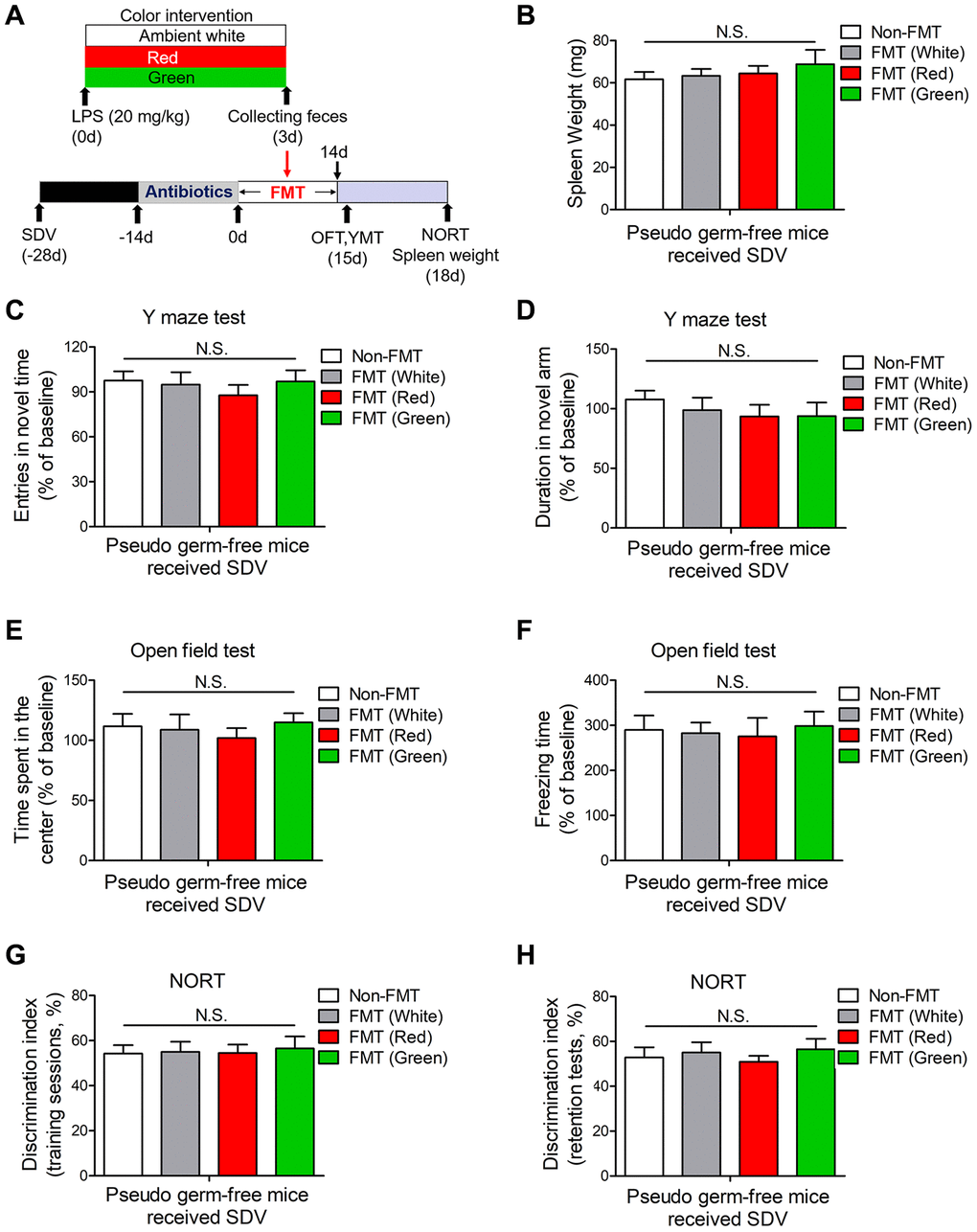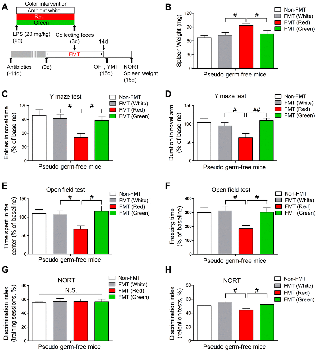 In part C, we first prepared pseudo germ-free mice as recipients for the FMT experiments, as follows. Broad-spectrum antibiotics (ampicillin 1 g/L, neomycin sulfate 1 g/L and metronidazole 1 g/L; Sigma-Aldrich) dissolved in drinking water were given ad libitum to C57BL/6 mice for 14 consecutive days. The drinking solution was renewed every two days. After their commensal gut microflora had been depleted, the mice were given fecal microbiota from LPS (20 mg/kg)-treated mice exposed to 3 days of red, green or ambient white light for 14 consecutive days. Y maze and open field tests were conducted on day 15, and a NORT was performed on day 18 after the commencement of the FMT. Subsequently, the mice were euthanized, and their spleens were collected and weighed.