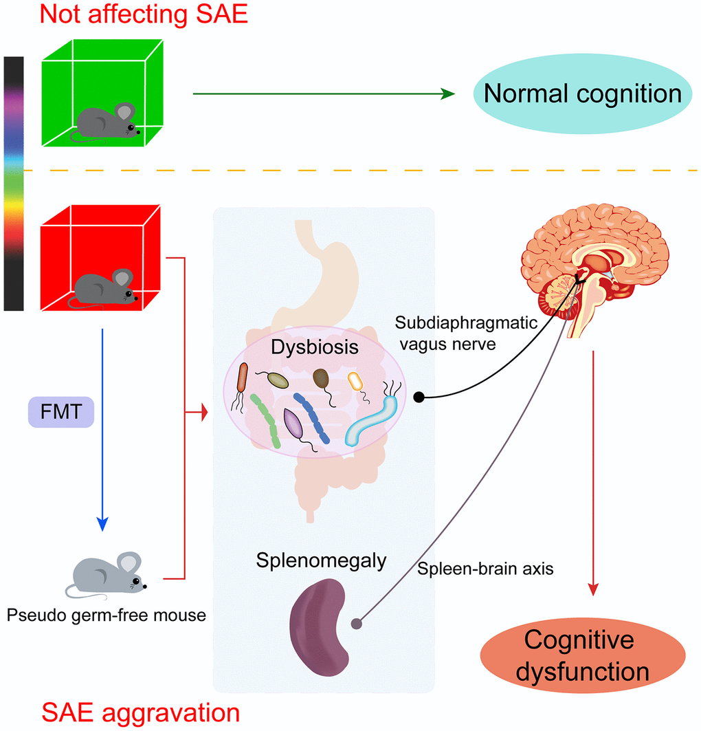 There were limitations to our present study. We only assessed the effects of two narrow-band monochromatic wavelengths of light (red and green) on cognitive function. The effects of shorter wavelengths of light on cognitive function should be further explored. Nevertheless, our study has revealed the unique effects of red light on the brain – namely, that prolonged red light exposure can potently impair cognitive function, especially in patients with SAE. Post-septic exposure to green light had no significant effects on the diversity and composition of the gut microbiota or on the weight of the spleen, which may explain its non-significant effects on cognitive function and anxiety-like behavior. Our findings highlight the importance of avoiding red light exposure in daily life for the sake of cognitive function, and provide evidence that an altered gut microbiome is an essential contributor to SAE.