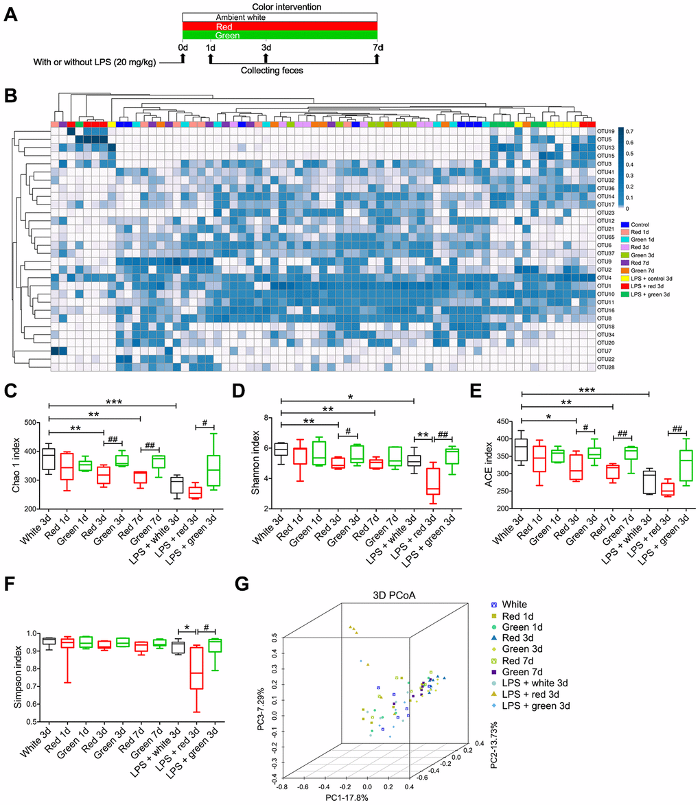 group than in the green light-exposed group on day 3 (P < 0.01 and P < 0.05, respectively) and day 7 (both P < 0.01), whereas the Shannon index was significantly lower in the red light-exposed group than in the green light-exposed group only on day 3 (P < 0.05) (Figure 3C–3E). In septic mice, the Shannon and Simpson indexes were significantly lower in the red light-exposed group than in the ambient white light-exposed group on day 3 (Figure 3D, 3F; P < 0.01 and P < 0.05, respectively). In addition, the Chao 1, Shannon, ACE and Simpson indexes in septic mice were significantly lower in the red light-exposed group than in the green light-exposed group on day 3 (Figure 3C–3F; P < 0.05, P < 0.01, P < 0.01 and P < 0.05, respectively). These data suggested that red light exposure greatly reduced the fecal microbial diversity in mice with or without LPS treatment, while green light exposure had no effect on the fecal microbiota after sepsis. Accordingly, in a 3D principal coordinate analysis, the dots representing the red light-exposed septic group were far from the dots representing the ambient white light- and green light-exposed septic groups (Figure 3G).