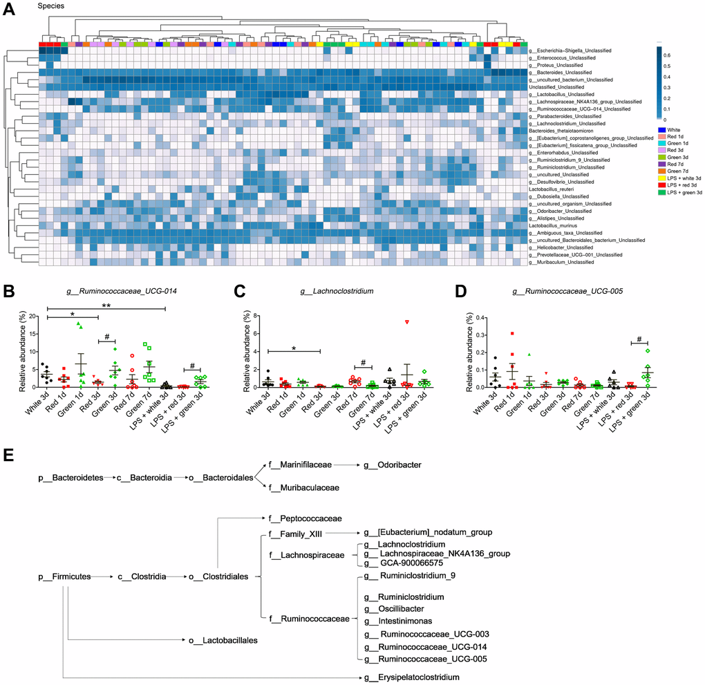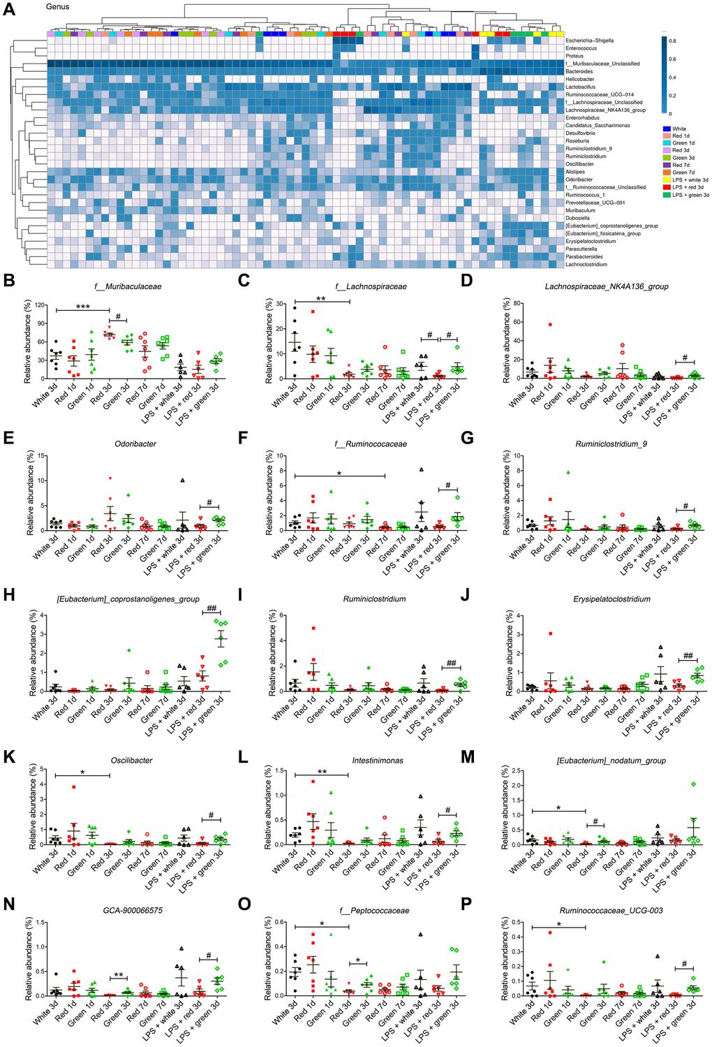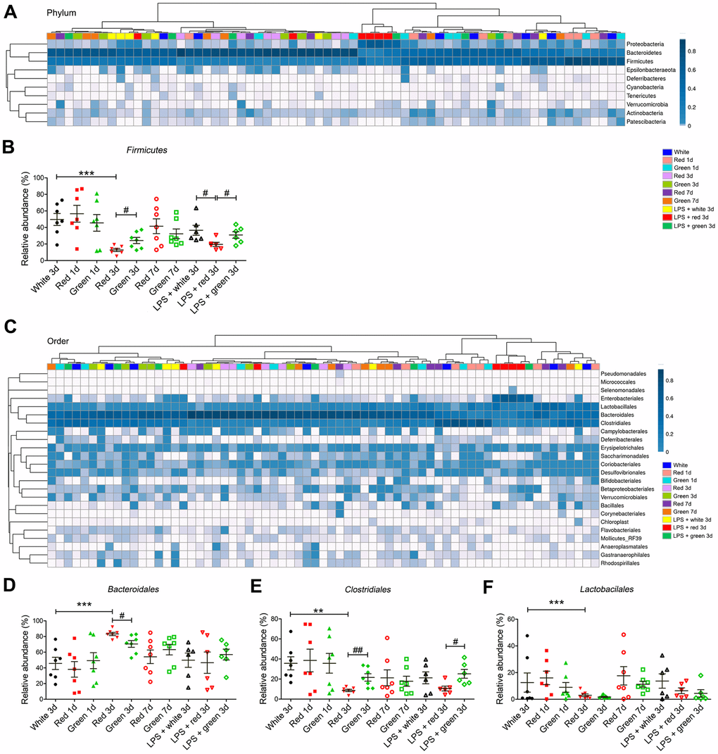 At the order level, in non-septic mice on day 3, the red light-exposed group had a significantly greater relative abundance of Bacteroidales (P < 0.001 and P < 0.05, respectively) and a significantly lower abundance of Clostridiales (both P < 0.01) than the ambient white light- and green light-exposed groups (Figure 4C–4E). In addition, the relative abundance of Lactobacillales on day 3 in non-septic mice was significantly lower in the red light-exposed group than in the ambient white light-exposed group (Figure 4F; P < 0.001). In LPS-treated mice, the relative abundance of Clostridiales was significantly lower in the red light-exposed group than in the green light-exposed group (Figure 4E; P < 0.05).