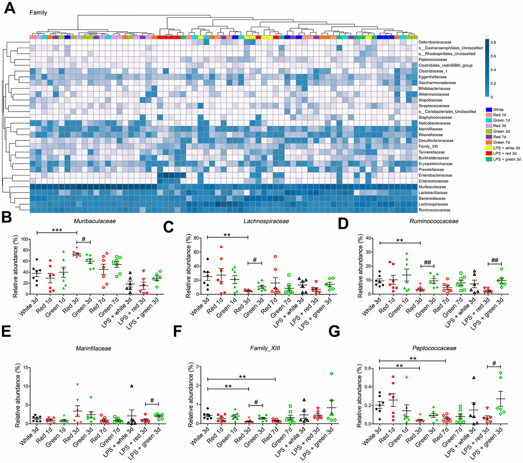 At the family level, the red light-exposed group had a greater relative abundance of Muribaculaceae (Figure 5A, 5B; P < 0.001 and P < 0.05, respectively) but lower relative abundances of Lachnospiraceae (P < 0.01 and P < 0.05, respectively), Ruminococcaceae (both P < 0.01) and Family-XIII (P < 0.01 and P < 0.05, respectively) than the ambient white light- and green light-exposed groups on day 3 in non-septic mice (Figure 5C, 5D, 5F). The relative abundances of Family-XIII and Peptococcaceae in non-septic mice on days 3 and 7 were significantly lower in the red light-exposed group than in the ambient white light-exposed group (Figure 5F, 5G; all P < 0.01). In septic mice, the abundances of Ruminococcaceae, Marinfilaceae and Peptococcaceae were lower in the red light-exposed group than in the green light-exposed group on day 3 (Figure 5D, 5E and 5G; P < 0.01, P < 0.01 and P < 0.05, respectively).