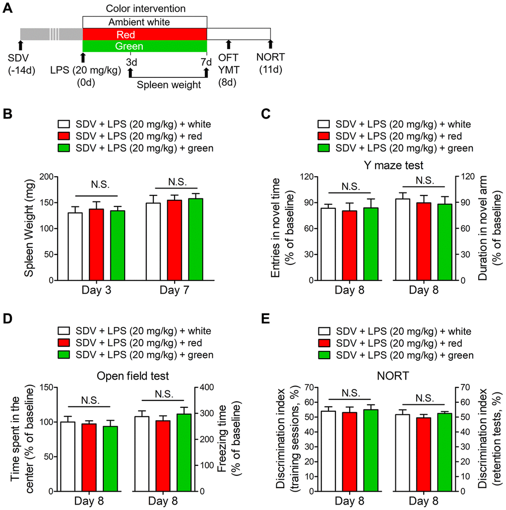 In part D, mice were subjected to a total SDV 14 days before LPS administration. They were then administered 20 mg/kg LPS and exposed to different colors of light for three or seven days. On days 3 and 7 after the commencement of light exposure, the spleens of some mice were collected and weighed. In other mice, Y maze and open field tests were conducted on day 8 and a NORT was performed on day 11 after the commencement of light exposure.