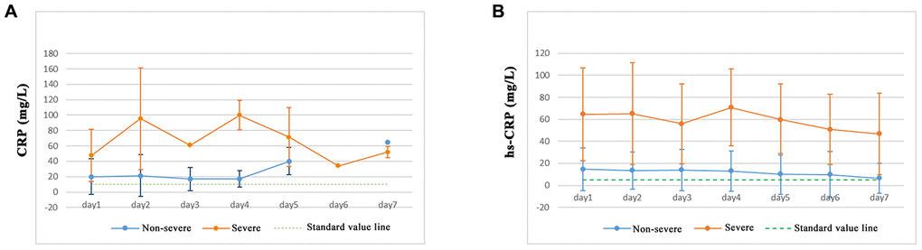 Serum inflammatory factor levels of IL-2, IL-1β, IL-4, IL-6, IL-5, IL-10, IL-8, IL-12P70, IL-17, IFN-α, TNF-α, IFN-γ, and endotoxin in COVID-19 patients showed no significant differences between non-severe and severe pneumonia patients. However, IL-6, IL-1β, and IL-8 expression levels in severe pneumonia patients were increased, and the levels of IL-6 showed the greatest increase. The levels of C-reactive protein (CRP) and high-sensitivity C-reactive protein (hs-CRP) were significantly increased in both non-severe and severe pneumonia patients. A higher proportion of the severe pneumonia patient population had increased CRP and hs-CRP levels (Table 3). Severe pneumonia patients showed higher levels of CRP (Figure 2A) and hs-CRP (Figure 2B) in the first 7 days of analysis, suggesting that SARS-CoV-2 has bacterial infection characteristics. Serum inflammatory factor levels of IL-2, IL-1β, IL-5, IL-4, IL-6, IL-8, IL-10, IL-17, IL-12P70, IFN-α, TNF-α, IFN-γ, endotoxin, CRP, and hs-CRP of non-severe COVID-19 patients across different age groups (< 50, 50–60, 60–70, and ≥ 70 years) were not significantly different (Table 3).