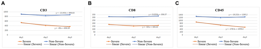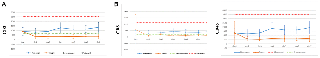 How changes in immune cell number can be used to distinguish between severe and non-severe patients has important clinical significance. After analyzing the results of CD3, CD8, and CD45 levels in the first 3 days, it was found that the K-value change was the most significant in the severe group, especially for CD3 (-85) and CD45 (-178.5). The analysis found that cut-off values for CD3 and CD45 were -66.7 and -94.33, respectively. Clinical test found that the K-values for both CD3 and CD45 in non-severe case were on the up of the cut-off values, indicating a 100% prediction success rate for severe and non-severe cases following SARS-CoV-2 infection. It is likely that CD45 is more clinically meaningful to distinguish severe SARS-CoV-2 cases from non-severe cases. We believe that this standard will aid in the clinical assessment of non-severe and severe patients. Due to the limited sample size of SARS-CoV-2 cases, large sample collection will be needed in future studies for the precise prediction of severe and non-severe cases following SARS-CoV-2 infection.