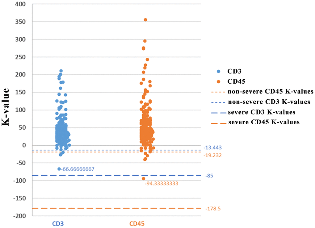 Analysis of the levels of CD3 (Figure 4A), CD8 (Figure 4B), and CD45 (Figure 4C) levels in the first 3 days of analysis showed that CD3 and CD45 were more significantly decreased in severe cases compared with non-severe cases. The K-values for CD3 and CD45 in severe cases were -85 and -178.5, respectively, while the K-values for CD3 and CD45 in non-severe cases were -13.4 and -19.2, respectively. Thus, the change in K-value was most significant in the severe group, especially for CD3 (-85) and CD45 (-178.5). The analysis found that cut-off values for CD3 and CD45 were -66.7 and -94.33, respectively. A clinical test, using 80 COVID-19 patients for backward verification, revealed that the K-values for both CD3 and CD45 in non-severe cases were above the cut-off values, indicating a 100% prediction success rate for severe and non-severe cases following SARS-CoV-2 infection (Figure 5).