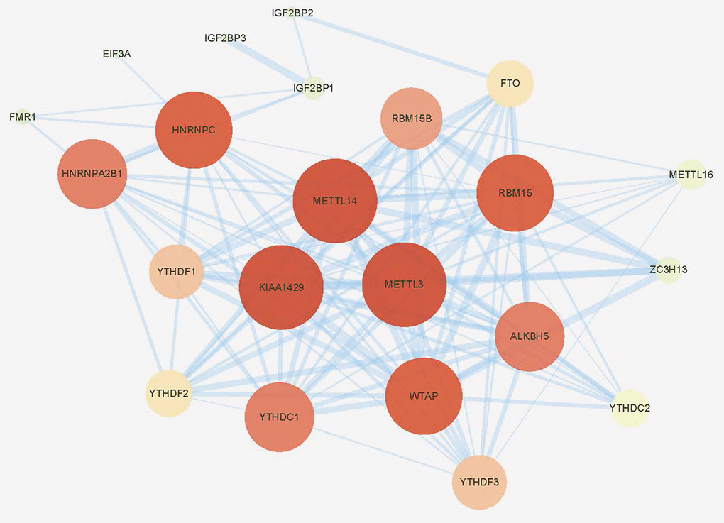 M6A-related research has grown rapidly in recent years. To include all genes that have been experimentally confirmed to yield m6A regulating functions as much as possible, we first searched PubMed for all literatures relating to m6A. After carefully archiving, 2 reviews published in 2019 that comprehensively summarized all the m6A regulatory genes was adopted [15, 16]. Finally, twenty-four genes were included in subsequent studies by intersecting with the genome and transcriptome-sequencing gene set on TCGA, including 9 “writers”, 13 “readers” and 2 “erasers”. Protein-protein interaction (PPI) network analysis was then applied using “STRING” database (https://string-db.org/) and CytoScape software (National Resource for Network Biology, USA) to display the interaction between these m6A regulators. As shown in Figure 1, three “writer” genes, METTL3, METTL14 and KIAA1429 (also known as VIRMA) seemed to be the hub genes in this network. This result brought some preliminary hints for our next research.