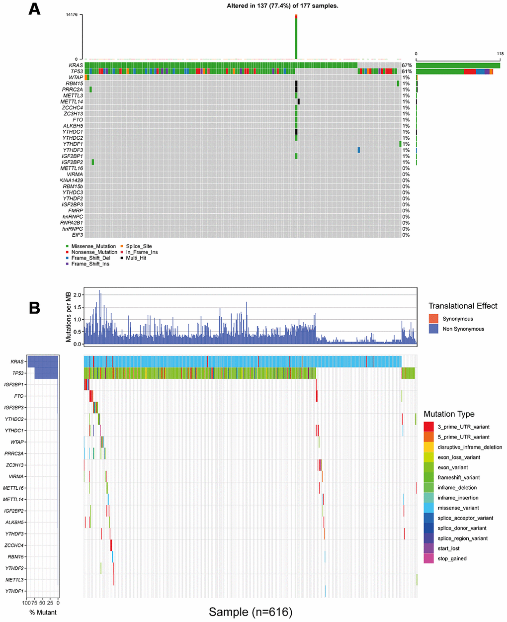 The relationship between alterations (CNAs and/or mutations) of m6A regulatory genes and the clinicopathological characteristics of PAAD patients were analyzed. Results showed that alterations of m6A genes were significantly associated with the patients’ gender, tumor grade and the maximum diameter of resected tumor. More concretely, male patients had a higher frequency of mutations or CNAs than female patients; patients with larger tumor volumes and higher histopathological grade also tended to show increased alterations of m6A genes (Table 3).