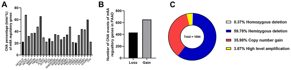 Given that no copy number alteration (CNA) related data was provided in two datasets from ICGC database, TCGA_PAAD cohort became our only remaining data source for the next CNA analysis. In this cohort, 125 of these 149 cases (83.89%) had CNA events of m6A regulatory genes, which meant that CNAs occurred very frequently in PAAD patients. The “writer” gene METTL16 had the highest frequency of CNA events (57.05%, 85/149), followed by WTAP and ALKBH5, which were “writer” and “eraser” genes, respectively (Figure 3A).