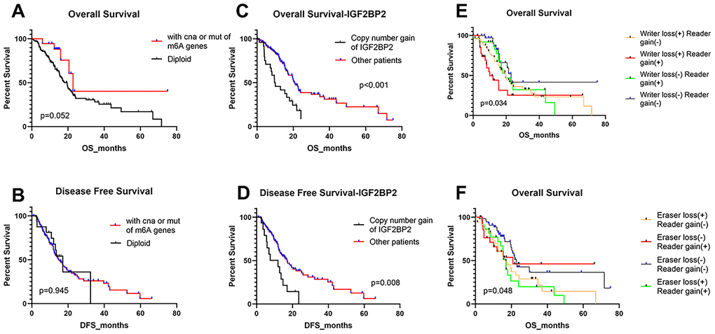 The above results made us interested in the impact of these alterations on patients’ prognosis. Thus, we analyzed the effects of overall alterations of m6A regulatory genes and some certain high-frequency CNAs on patients’ overall survival (OS) and disease-free survival (DFS). However, results did not seem to be ideal. Individuals with or without mutations or CNAs of m6A regulatory genes didn’t have any significant correlation with OS and DFS (Figure 4A, 4B). Furthermore, separate analysis of the included 24 genes revealed that most single CNA events didn’t affect OS and DFS (Supplementary Figure 1, 2). The only exception is IGF2BP2, a m6A “reader” gene. Patients with copy number gain of IGF2BP2 showed significantly poorer OS and DFS than other patients without this alteration (Figure 4C, 4D).