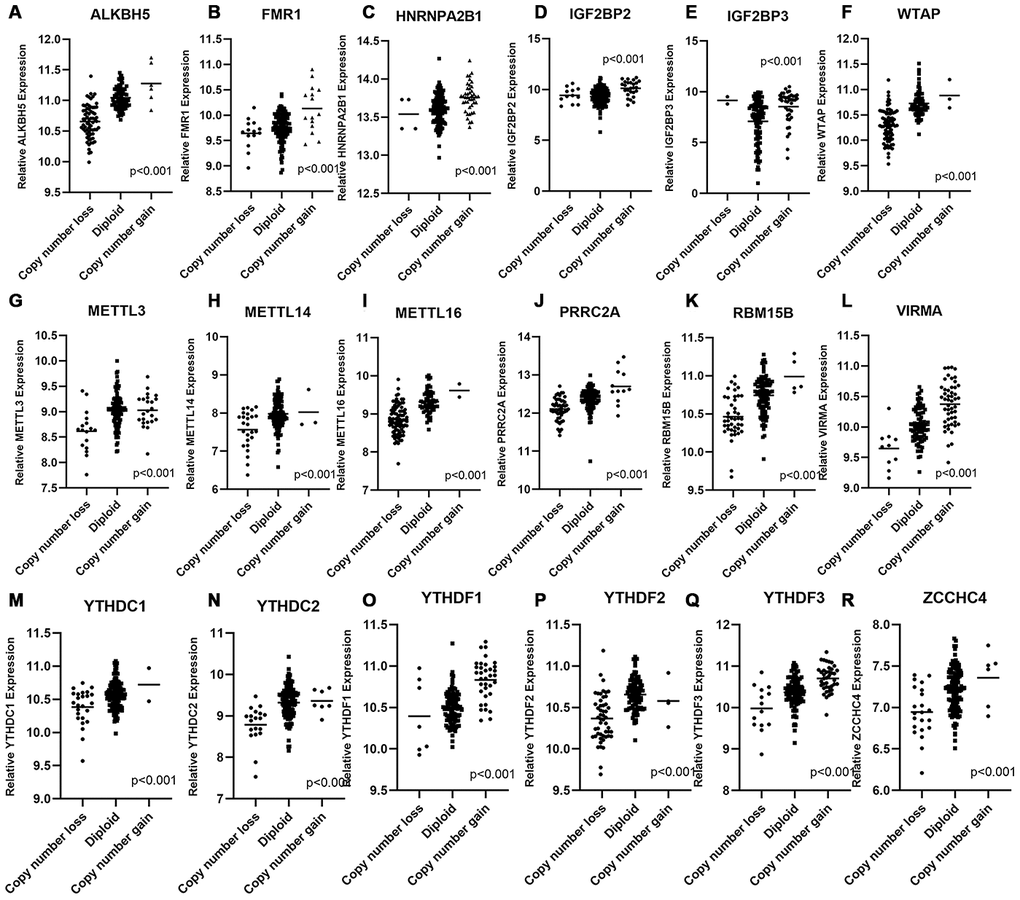 We wondered whether CNAs of m6A regulatory genes at the genomic level were related to their mRNA expression status. The results of correlation analysis showed that mRNA expression level was significantly associated with most of the CNA patterns in PAAD samples. In 21 of 24 detected genes, copy number gains and high-level amplifications were related to higher mRNA expression; while homozygous and hemizygous deletions resulted in a declined level of mRNA (Figure 5A–5R and Supplementary Figure 4A–4C). No significant relation was found between the CNAs of FTO, RBM15 and ZC3H13 and their mRNA expression level (Supplementary Figure 4D–4F).