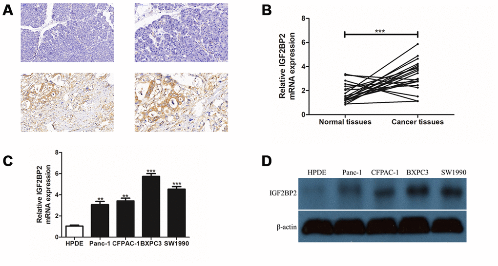 Based on the above results, we had a strong interest in the expression status and mechanism of IGF2BP family in PAAD pathogenesis. IGF2BP family contained three members. As mentioned in our previous results, IGF2BP1 had the highest mutation frequency, while IGF2BP3 showed the highest CNA frequency; however, only IGF2BP2 was associated with patient prognosis, and most likely there was a significant increase in its mRNA expression. Thus, IGF2BP2 was chosen as the candidate gene for further experimental detection. Immunohistochemistry staining for IGF2BP2 expression was firstly performed in 3 pairs of PAAD tissues and their adjacent normal tissues. We found that IGF2BP2 protein was highly expressed in all three pairs of PAAD tissues than that of normal (Figure 6A and Supplementary Figure 6). Then, 20 pairs of PAAD clinical specimens with their adjacent normal pancreatic tissue were extracted to detect the mRNA expression level of IGF2BP2. It turned out that IGF2BP2 was significantly overexpressed in PAAD cells from clinical samples than normal pancreatic cells (Figure 6B). We further utilized 5 cell lines (four PAAD cell lines: Panc-1, CFPAC-1, BXPC-3, SW1990; one normal pancreatic ductal epithelial cell line: HPDE) to verify IGF2BP2 expression at mRNA and protein level in vitro. qRT-PCR and Western Blotting results further confirmed the presence of up-regulated mRNA and protein expression of IGF2BP2 in PAAD (Figure 6C, 6D).