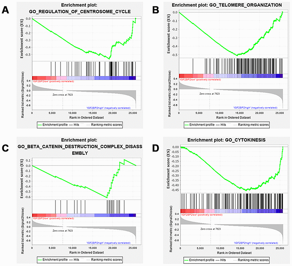 Gene set enrichment analysis (GSEA) provided by the JAVA program (Version 4.0.3) with MSigDB v6.1 was applied to explore the downstream biological processes affected by differential expression of IGF2BP2. Patients in the cohort was divided into two groups according to the median expression level of IGF2BP2. Finally, 25880 genes were enrolled into the GSEA process. Hallmark gene set “c5.bp.v7.0.symbols.gmt” was used in this study [35]. Gene sets which got highest Enrichment Score (ES) with normalized p-value <0.05, and the false discovery rate (FDR) <0.25 were considered significantly enriched.