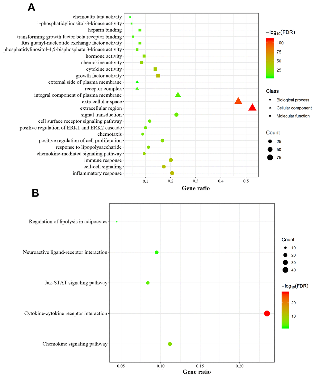 We retrospectively analyzed the TCGA breast cancer dataset, which included 1104 tumor samples and 113 normal adjacent samples, to identify differentially-expressed genes. A total of 2459 genes were identified as differentially expressed, with 1231 being upregulated and 1228 downregulated (Figure 1A, 1B). Since host immunity contributes to determining neoplasm destiny, here we focused on immunity-related genes. From these differentially-expressed genes, we extracted IRGs and obtained 69 upregulated and 110 downregulated IRGs (Figure 1C, 1D), which are listed in Supplementary Table 1. To gain insight into the biological roles of the 179 differentially-expressed IRGs, we performed GO and KEGG pathway enrichment analysis, which identified 64 relevant GO terms and five relevant KEGG pathways (Supplementary Table 2). As expected, GO analysis indicated that major terms enriched in the biological process category were signal transduction, inflammatory response and immune response. The most enriched cellular component terms were “extracellular region” and “extracellular space”. For the molecular function category, the primary enriched terms were growth factor activity, cytokine activity and chemokine activity (Figure 2A). KEGG pathway analysis revealed that the differentially-expressed IRGs were involved in cytokine-cytokine receptor interactions, chemokine signaling, and neuroactive ligand-receptor interactions (Figure 2B).