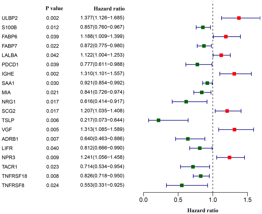 We next asked whether and which of the aforementioned 179 differentially-expressed IRGs could aid in disease management in breast cancer patients. Univariate Cox analyses revealed that 19 IRGs were associated with overall survival. Most of the 19 survival-associated IRGs were protective factors, as indicated by their hazard ratios (Figure 3).
