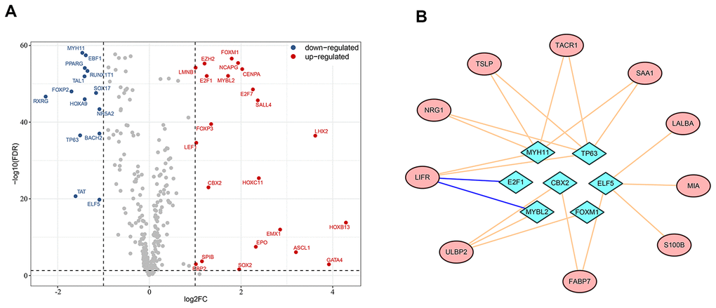 Dynamic alterations in the expression level of transcription factors can affect immune cell fates and tumor development and progression [17–19]. To investigate potential regulatory mechanisms of the survival-associated IRGs, we extracted candidate transcription factors from all differentially-expressed genes to analyze the associations in gene expression between transcription factors and survival-associated IRGs. Of the 36 differentially-expressed transcription factors we identified (Figure 4A), E2F1 and MYBL2 were negatively associated with LIFR expression, while CBX2, ELF5, FOXM1, MYBL2, MYH11 and TP63 were in positive associations with at least one of the survival-associated IRGs. Figure 4B shows a modulatory network illustrating the regulation between the above seven transcription factors and survival-associated IRGs.