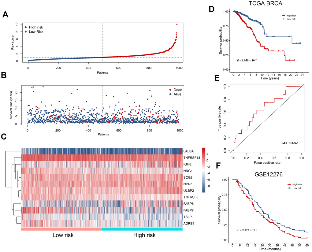 Our immunity-based prognostic signature consists of 12 survival-associated IRGs. Among them, ULBP2, TSLP, TNFRSF8 and TNFRSF18 are involved in intercellular cytokine-mediated communications. ULBP2 is one of the NKG2D ligands to cause release of multiple cytokines and chemokines that help to activate NK cells. However, soluble ULBP2 secreted by tumor cells also contributes to evasion of immunosurveillance. Recent studies have found that elevated expression of ULBP2 is an indicator of poor prognosis in ovarian and pancreatic cancer [40, 41]. Similarly, our analysis revealed that ULBP2 is upregulated in breast cancer with detrimental effects on patient overall survival. TNFRSF8 is a tumor necrosis factor with unclear contributions to breast cancer. Here, we found a decreased expression of TNFRSF8, similar to a recent immunohistochemistry-based study that reported a lack of CD30 expression in breast cancer [42]. Moreover, its downregulation was found to be associated with poor prognosis. Interestingly, here we found that TSLP expression is reduced in breast cancer patients and correlates positively with a favorable prognosis, both in disagreement [43] and agreement [44] with previous reports. Further efforts are required to better understand TSLP functions in breast cancer. In line with previous research [45], we confirmed here that NRG1 is downregulated in breast cancer tissues, with detrimental effects on long-term survival. FABP7 was previously associated with lower lymph node stage and a longer disease-free survival [46], which supports our finding that high FABP7 expression contributes to a low risk score. Serum alpha-lactalbumin (LALBA) was previously identified as a marker for breast cancer [47]. We found that high LALBA expression was a hazardous prognostic factor. The roles of other IRGs in our signature in breast cancer, including IGHE, SCG2, NPR3 and FABP6, require further clarification.