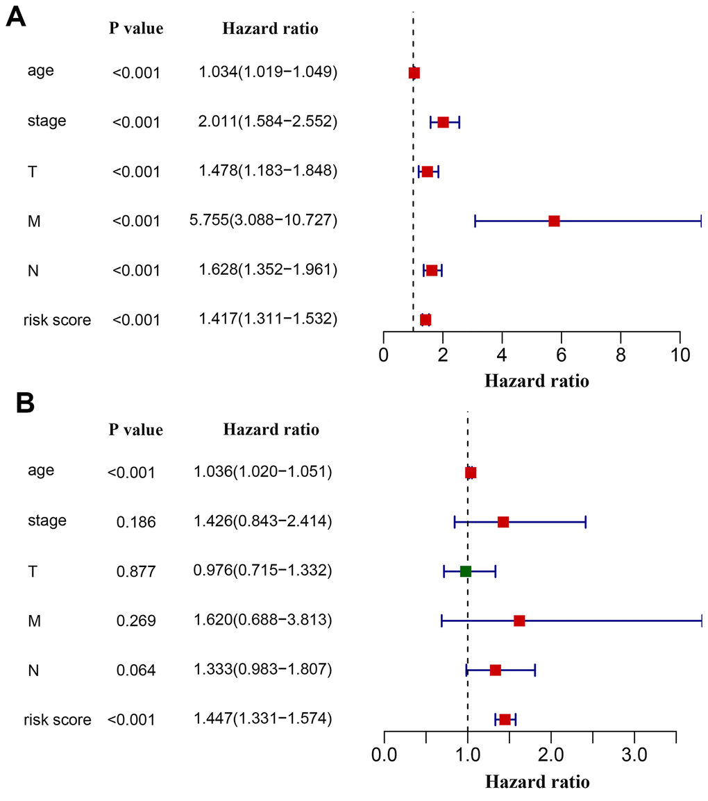 We next investigated whether the power of the immunity-related prognostic model was influenced by confounding factors. In addition to the risk score derived from the prognostic model, relevant clinical characteristics including age, tumor stage and TNM classification were used for univariate analysis. As expected, all of these factors were associated with a poor prognosis, with a metastatic disease being the most hazardous factor (Figure 6A). According to multivariate regression, age (HR = 1.036, 95% CI: 1.020−1.051, P < 0.001) and risk score (HR = 1.447, 95% CI:1.331−1.574, P < 0.001) were independent factors correlated with shorter overall survival (Figure 6B). However, the hazard ratios indicated that the prognostic model-derived risk score was a more powerful factor to assess patient prognosis. We also excluded patients without tumor stage information to investigate the correlation of the derived risk score with tumor stage. We compared the risk scores of the Stage i-iia group to those of the Stage iib-iv group and found that risk scores were higher in the latter than in the former (Supplementary Table 3).