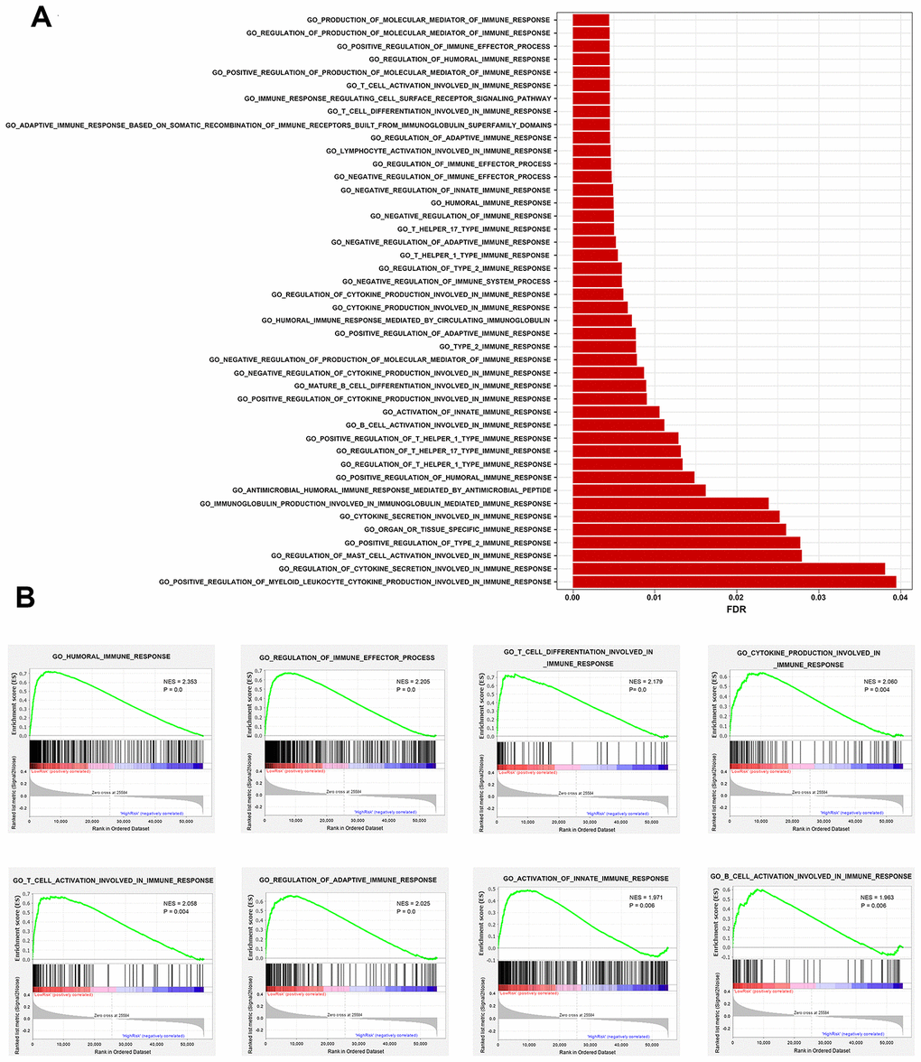 To investigate immune response processes affected by the hub IRGs in the prognostic signature, we performed gene set enrichment analysis (GSEA) between high- and low-risk groups. Immunity-related gene sets in GO terms were downloaded from the Molecular Signatures Database (MSigDB) for GSEA analysis. A gene set was considered enriched for P < 0.05 and FDR < 0.25.