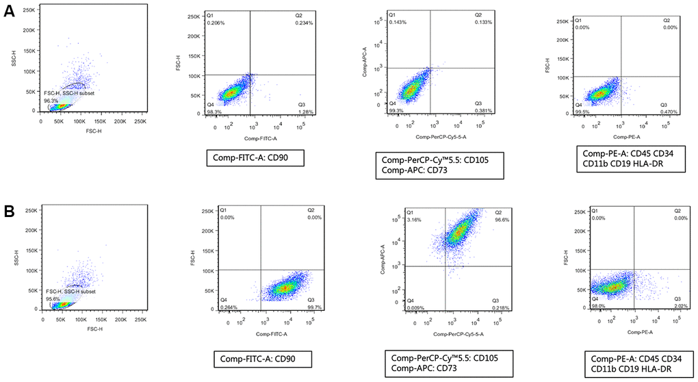 MSCs have specific surface molecular markers; they are positive for CD73, CD90, and CD105 and negative for CD34, CD45, CD11b, CD19, and HLA-DR [25, 26]. In our study, we first used flow cytometry to analyze and identify MSCs extracted from umbilical cord. As shown in Figure 1B, we first tested the positive molecular markers (CD90, CD105, and CD73) on the surface of MSCs, which were marked by FITC, PerCP-Cy™5.5, and APC, respectively. Subsequently, we tested the negative molecular markers (CD34, CD45, CD11b, CD19, and HLA-DR) on the surface of MSCs, which were marked by PE (Figure 1B). We used isotype antibodies as the control group (Figure 1A). When compared with the control group, the cells we used were verified as hMSCs.