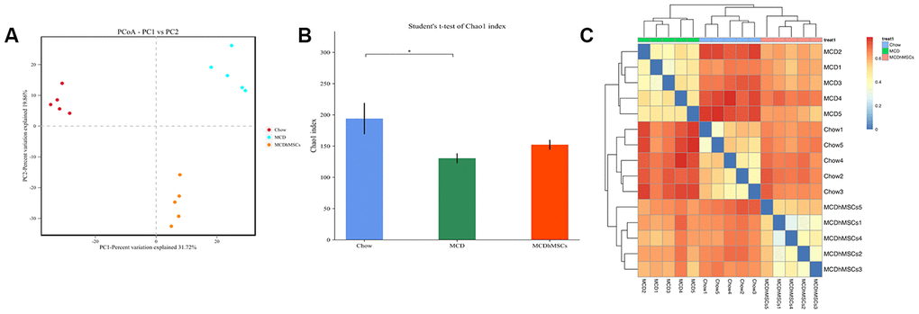 First, we analyzed the principal components of intestinal flora among different groups, which was performed to calculate the beta-diversity values. As shown in Figure 3A, three groups, namely, the chow, MCD, and MCD+hMSCs groups, showed a clustering tendency in the first predictive principal component (X axis) and second predictive principal component (Y axis) in the unweighted UniFrac principal coordinate analysis (PCoA). Next, we conducted alpha diversity analysis (Chao1) of mouse flora, which represented the stability of intestinal flora. As shown in Figure 3B, the number of intestinal flora in MCD diet group was significantly lower than that in the chow group, and hMSCs treatment increased the number of intestinal flora despite that no statistical difference was achieved. Subsequently, we analyzed the binary Jaccard clustering health map to further observe the integrity differences in the mice flora among the three groups. As depicted in Figure 3C, the hMSCs treatment effectively alleviated the flora disorder induced by MCD diet.