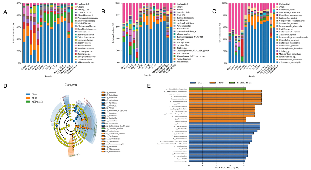 The hMSCs treatment alleviated intestinal flora disorder induced by MCD diet. Next, to further explore the distribution difference of intestinal flora among the three groups, we studied flora diversity at the level of family, phylum, and species.