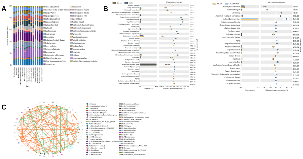 hMSCs could improve the intestinal flora disorder induced by MCD diet to some extent. To further elucidate the beneficial role of the altered microbial community, we studied the metabolic pathway and the interaction relationship of species among intestinal flora.