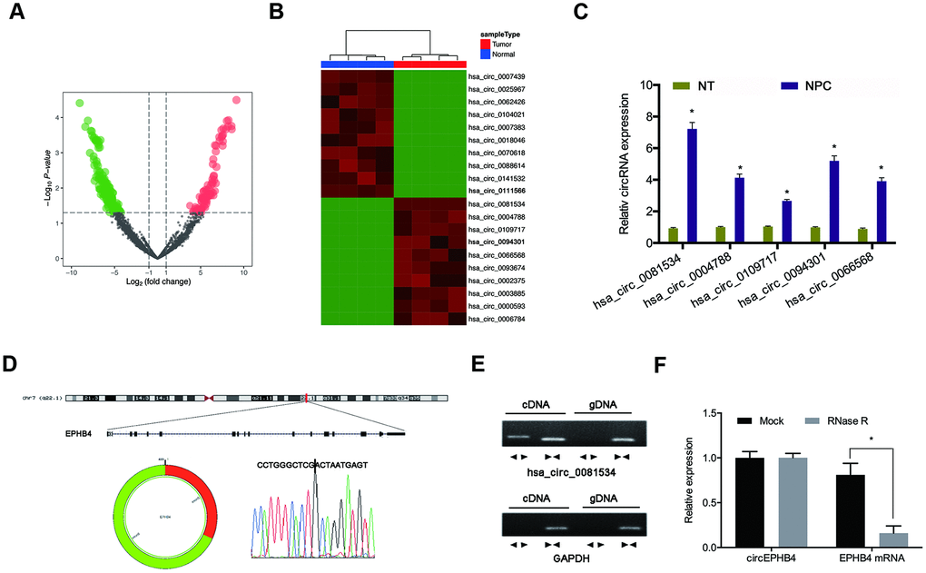 To assess measures of involvement of circRNAs in the pathogenesis of NPC, we firstly analyzed microarray expression profiles (GSE143797) comparing circRNA levels between NPC tissues and normal tissues. Results indicated that expression of 296 circRNAs were significantly altered in NPC tissues compared to adjacent normal tissues (fold change > 2.0 and p < 0.05) (Figure1A, 1B). Next, we selected the top 5-upregulated circRNAs from dataset GSE143797 and sought to verify the predictions in small samples (N = 5) of NPC tissues by use of qRT-PCR. Results indicated that hsa_circ_0081534 (circEPHB4) was the most significantly upregulated type of circRNAs of those we assessed in the NPC tissues (Figure 1C).