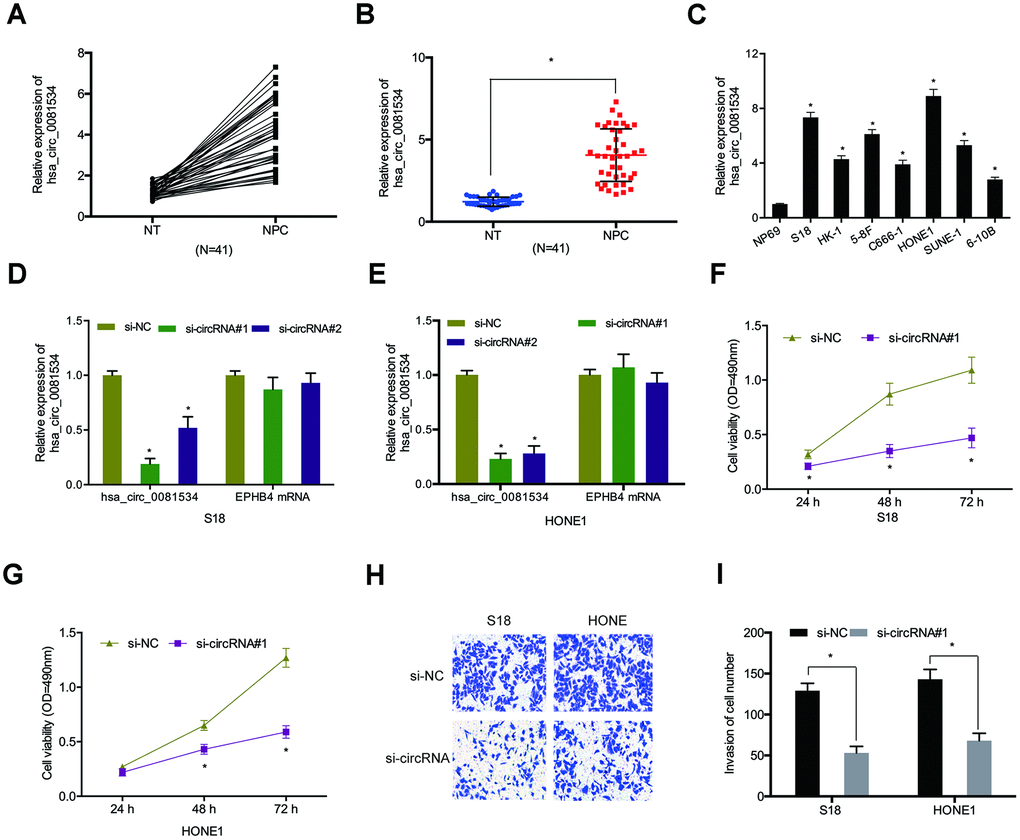 Next, we examined hsa_circ_0081534 expression in NPC tissues and cell lines. Results indicated that hsa_circ_0081534 expression increased in NPC tissues compared with adjacent normal tissues (NT) (Figure 2A, 2B). Similarly, hsa_circ_0081534 expression also was significantly enhanced in NPC cell lines (S18, HK-1, 5-8F, C666-1, HONE1, SUNE-1, and 6-10B) (Figure 2C). To investigate potential biological functions of hsa_circ_0081534, we transfected si-NC or si-circ_0081534 into S18 and HONE1 cells (Figure 2D, 2E). MTT assay revealed that si-circ_0081534 significantly decreased NPC cell proliferation in vitro (Figure 2F, 2G). Additionally, transwell assay indicated that inducing the down-regulation of hsa-circ_0081534 notably inhibited NPC cells invasion ability (Figure 2H, 2I). These data indicated that inducing the downregulation of hsa_circ_0081534 reduced NPC cells progression in vitro.