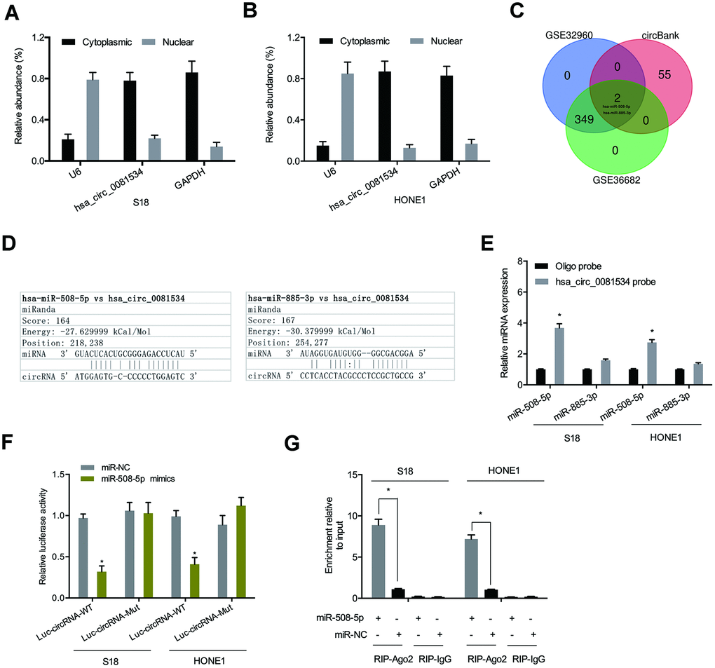 To assess mechanisms underlying the influence of hsa_circ_0081534 in NPC, we determined the location of hsa_circ_00815343 in NPC afflicted cells. Results indicated that subcellular localizations of hsa_circ_0081534 mainly occurred in cytoplasm (Figure 3A, 3B). Bioinformatic analyses suggested that both miR-508-5p and miR-885-3p were potential targets of hsa_circ_0081534 (Figure 3C, 3D). Pull down assay indicated that miR-508-5p was abundantly pulled-down by hsa_circ_0081534 probes in both S18 and HONE1 cells (Figure 3E). Next, correlations between hsa_circ_0081534 and miR-508-5p were further examined by use of dual-luciferase reporter and RIP assays (Figure 3F, 3G).